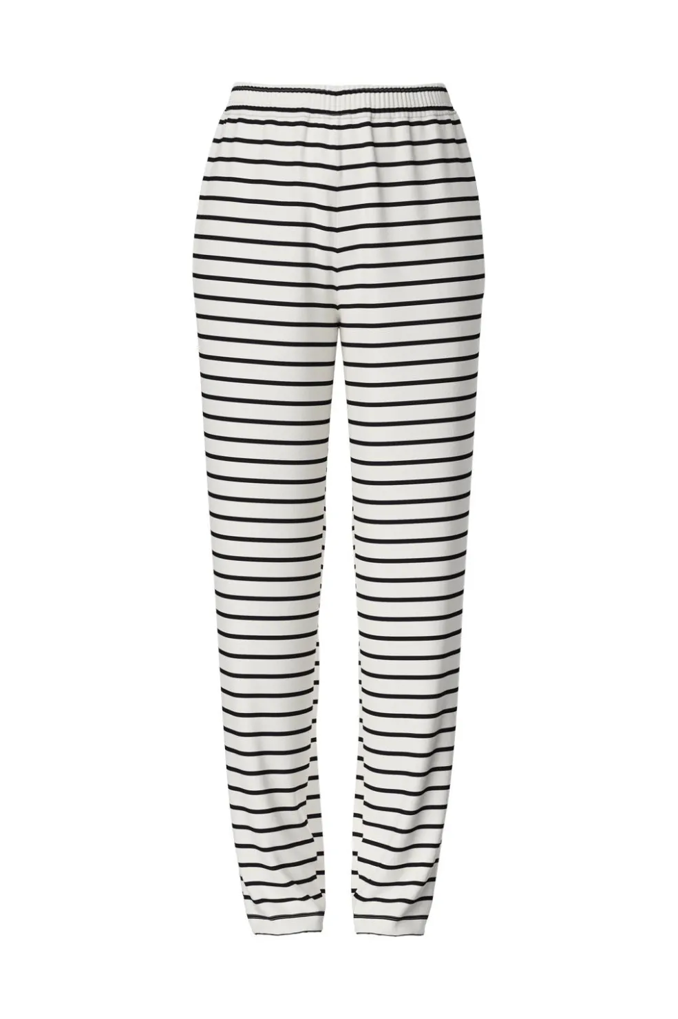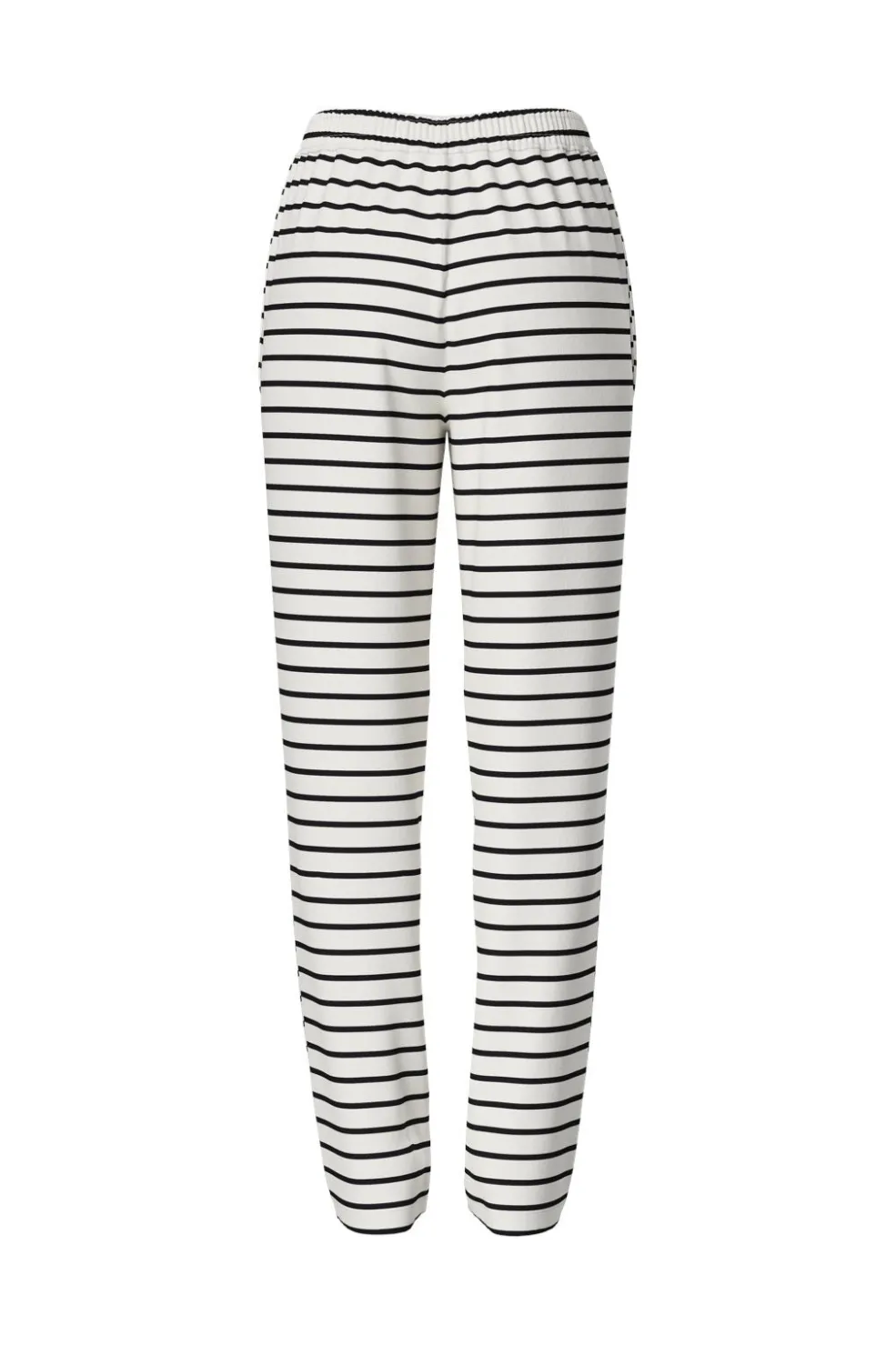 Stribede bukser fra Pieces i hvid og sort. Bukserne har en straight fit-pasform og ankellængde. De er højtaljede med elastisk taljebånd og praktiske sidelommer.