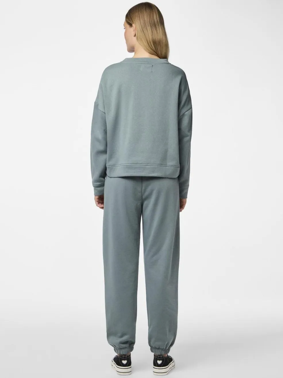 Sweatpants fra Pieces i en gråblå nuance. Bukserne har høj talje med elastik og snøre, der giver mulighed for at justere vidden.