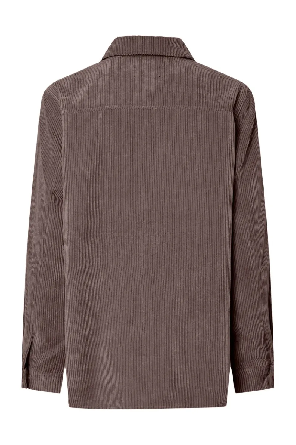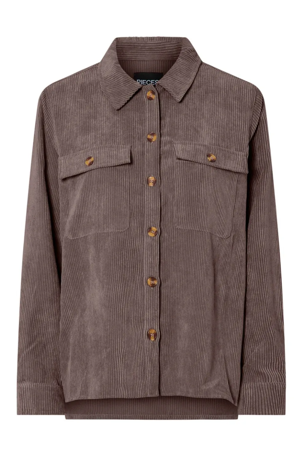 Brun skjorte fra Pieces, lavet af fløjl med en blød, ribbet overflade. Skjorten er fremstillet af 92 % genanvendt polyester og 8 % nylon.