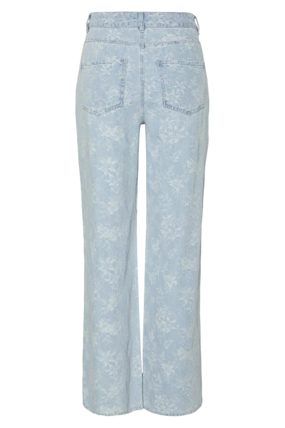 Lyseblå denimjeans fra Pieces med blomsterprint over hele overfladen. Jeansene har en wide leg-model med tætsiddende hofte og vidde i benene samt mellemhøj talje.