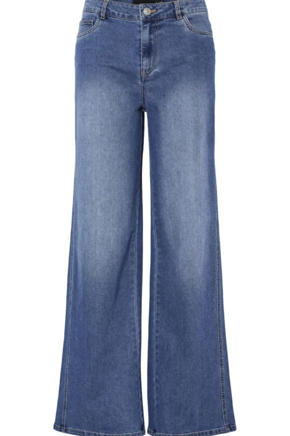 Brede jeans fra Pieces i medium blå denim. Jeansene har en høj talje og en løs pasform med brede ben, der går helt ned til gulvet.
