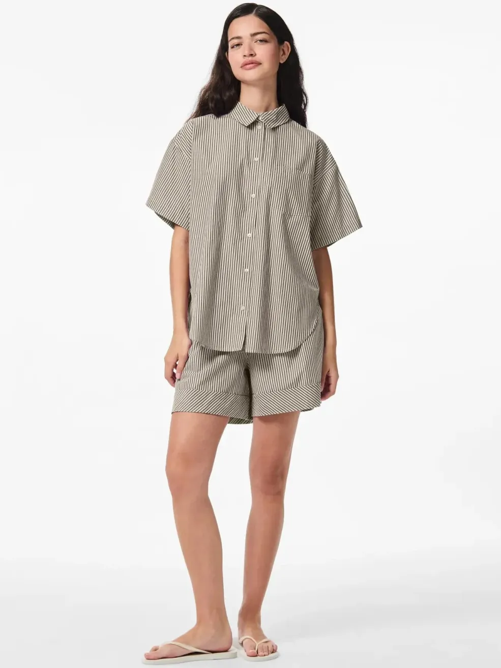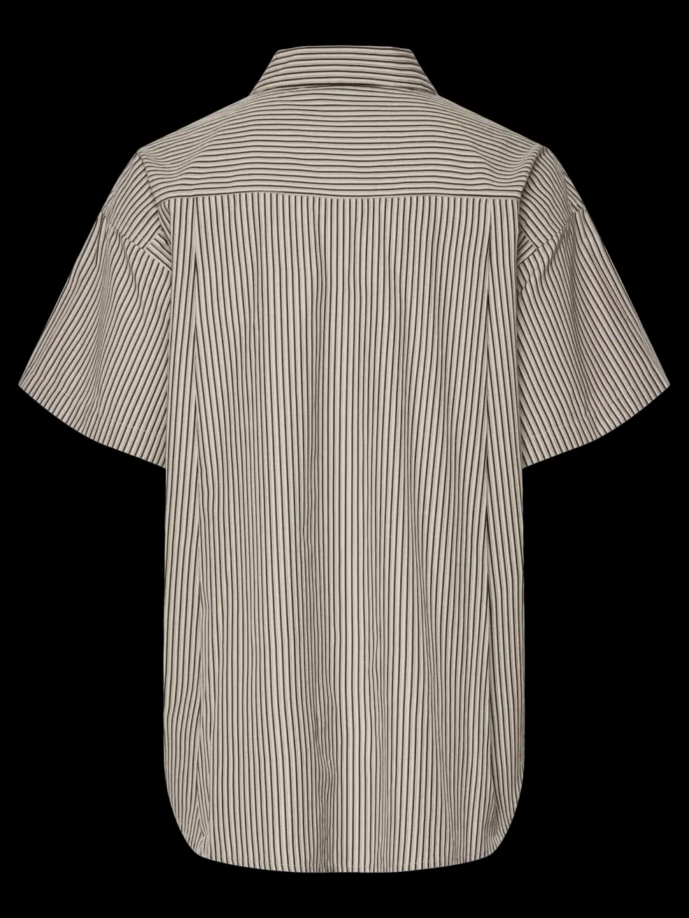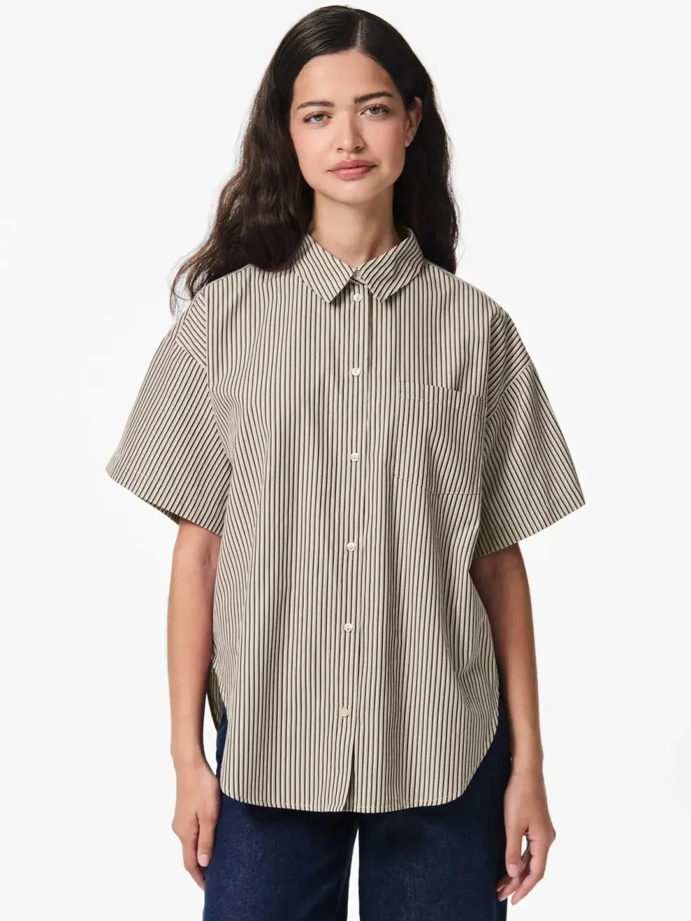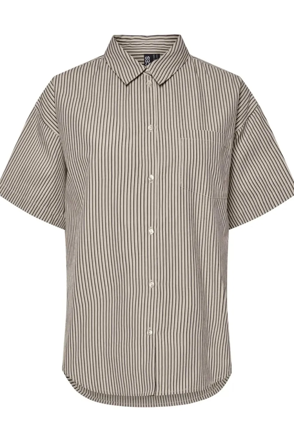 Stribet skjorte fra Pieces i en beige nuance. Skjorten har en løs pasform og korte ærmer; den er lavet af en polyester-bomuldsblanding.