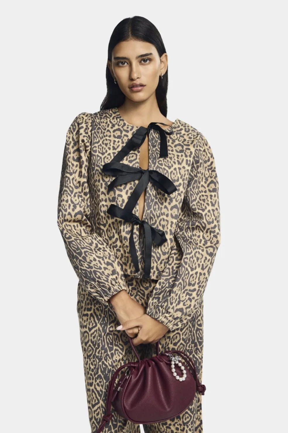 Sort bluse fra Pieces med beige leopardmønster. Den har et reversibelt design med sorte bindebånd foran og lange ærmer med puf-effekt. Blusen har en løs pasform.