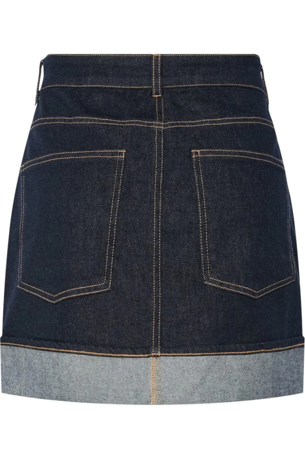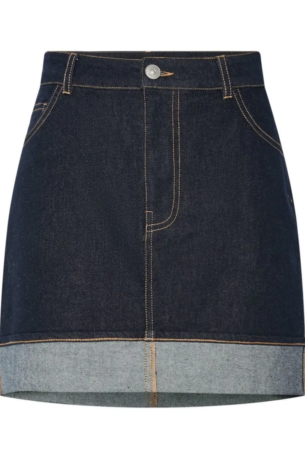 Kort denimskørt fra Pieces i mørkeblå denim. Et højtaljet design med slim fit og dekorative syninger. Skørtet har både for- og baglommer samt bæltestropper.