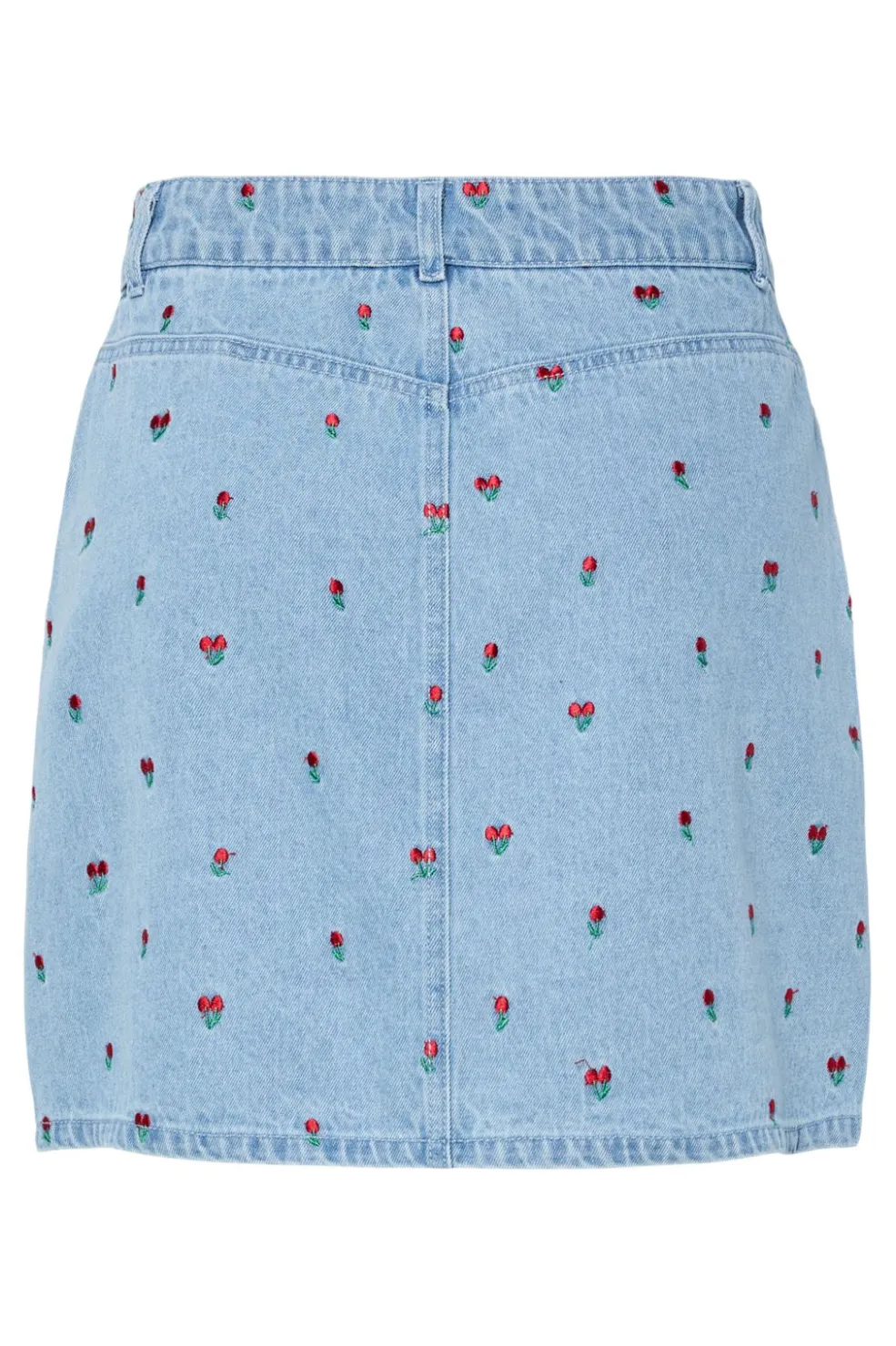 Kort denimnederdel fra Pieces i lys blå med broderede tulipaner. Den ekstra korte nederdel har høj talje og forlommer samt lukning med krogknap og lynlås.