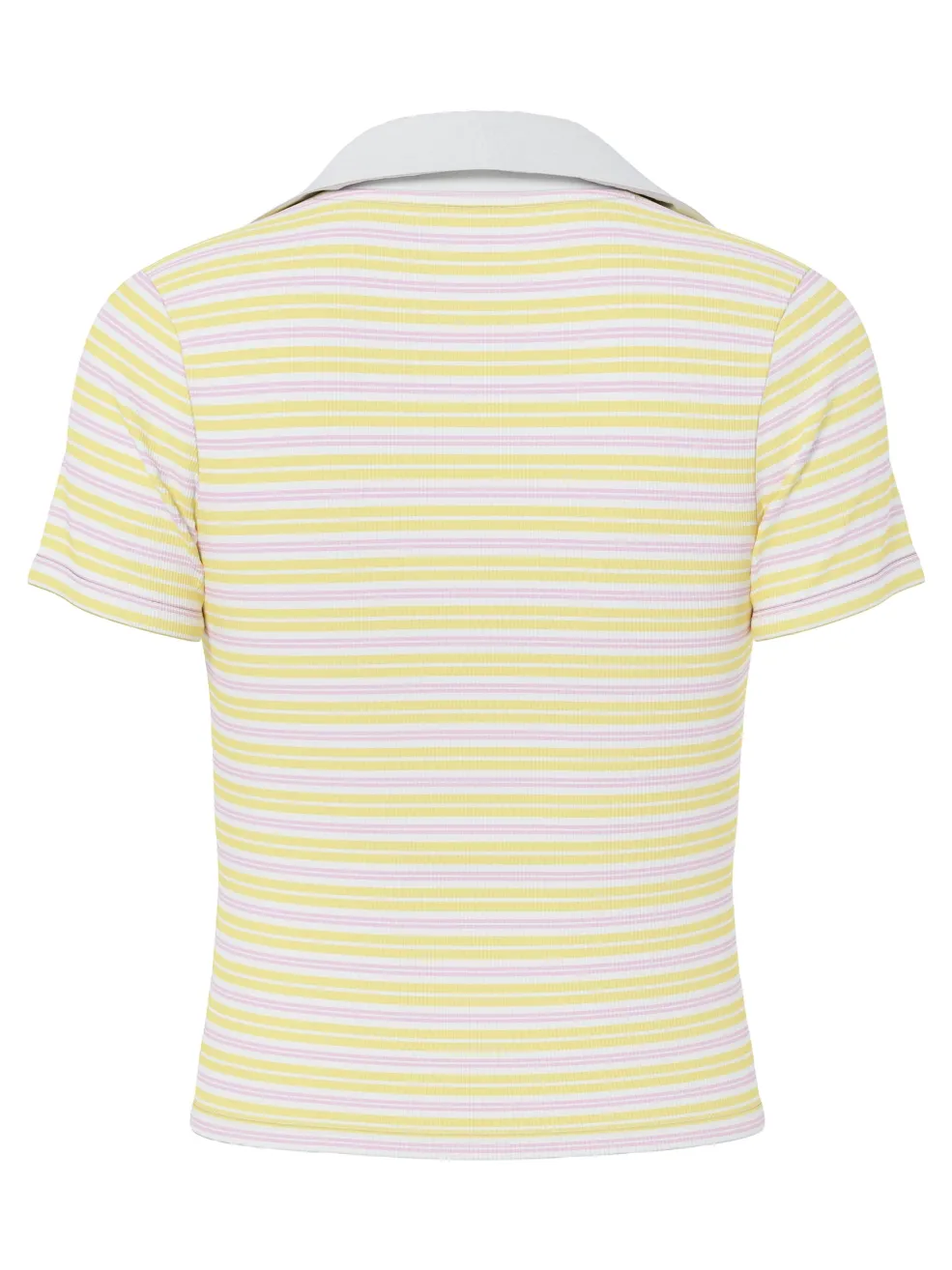 Stribet polo-top fra Pieces med hvid kontrastkrave og V-hals. De vandrette striber i gul, pink og hvid giver toppen et sommerligt udtryk. Designet med korte ærmer og regular fit.