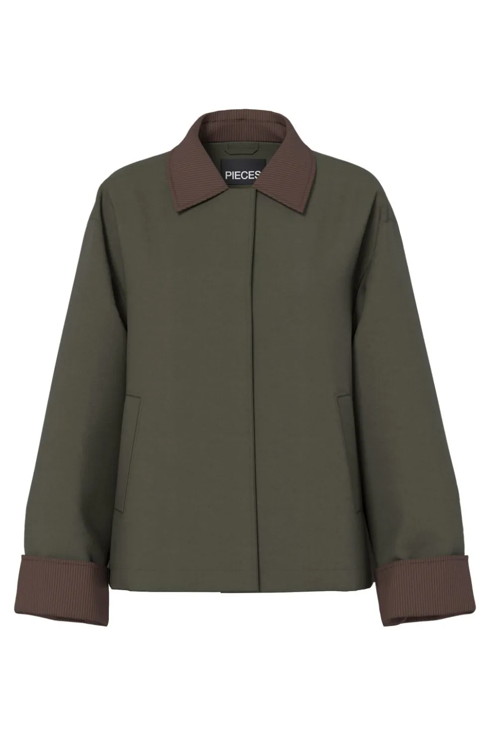 Kort let jakke fra Pieces i skovgrøn farve med brune accenter ved kraven og manchetterne. Jakken er lavet af polyester.