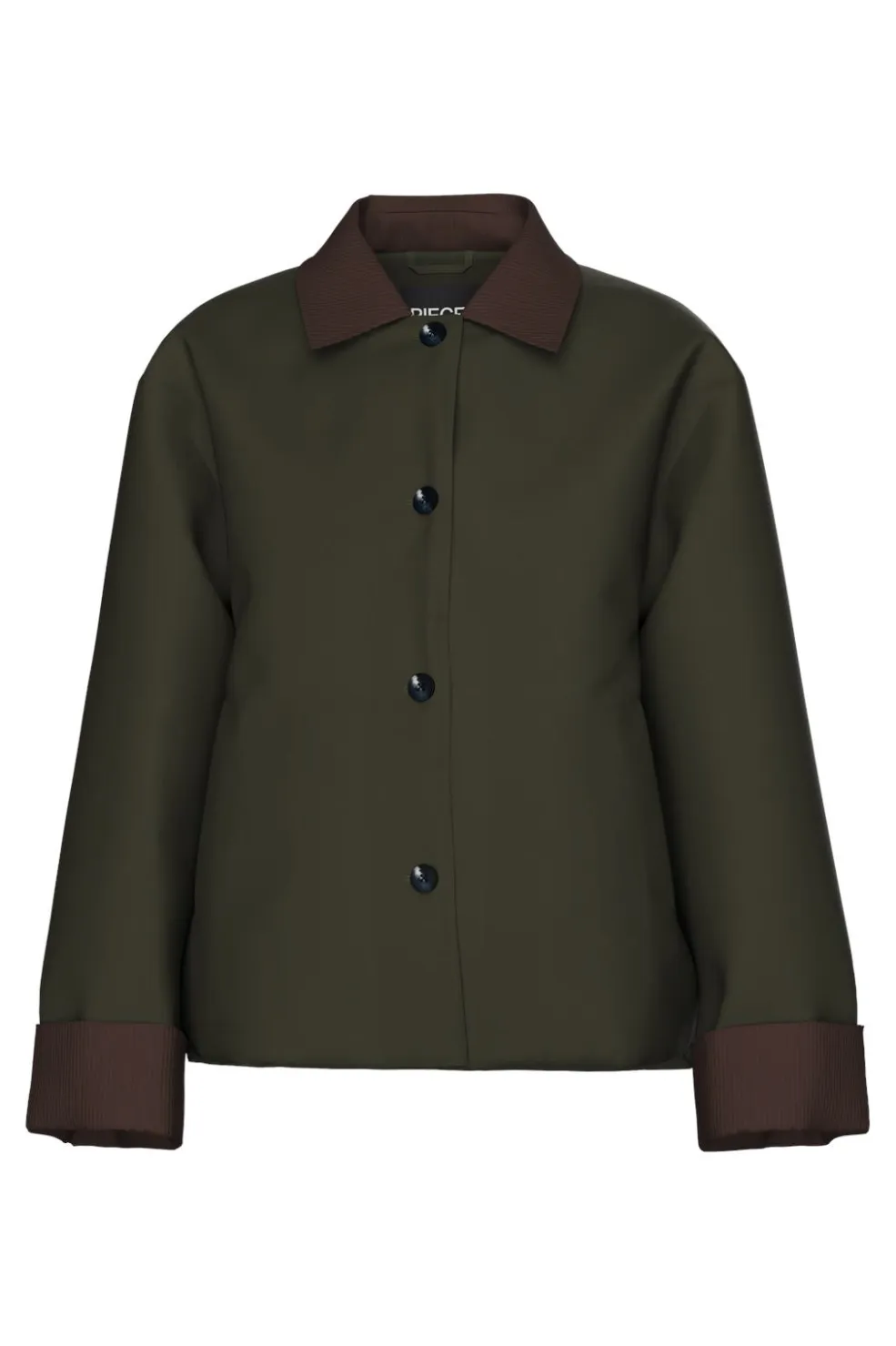 Kort polstret jakke fra Pieces i mørkegrøn med kontrastfarvet brun krave og manchetter. Jakken er lavet af 51 % genanvendt polyester og 49 % polyester.