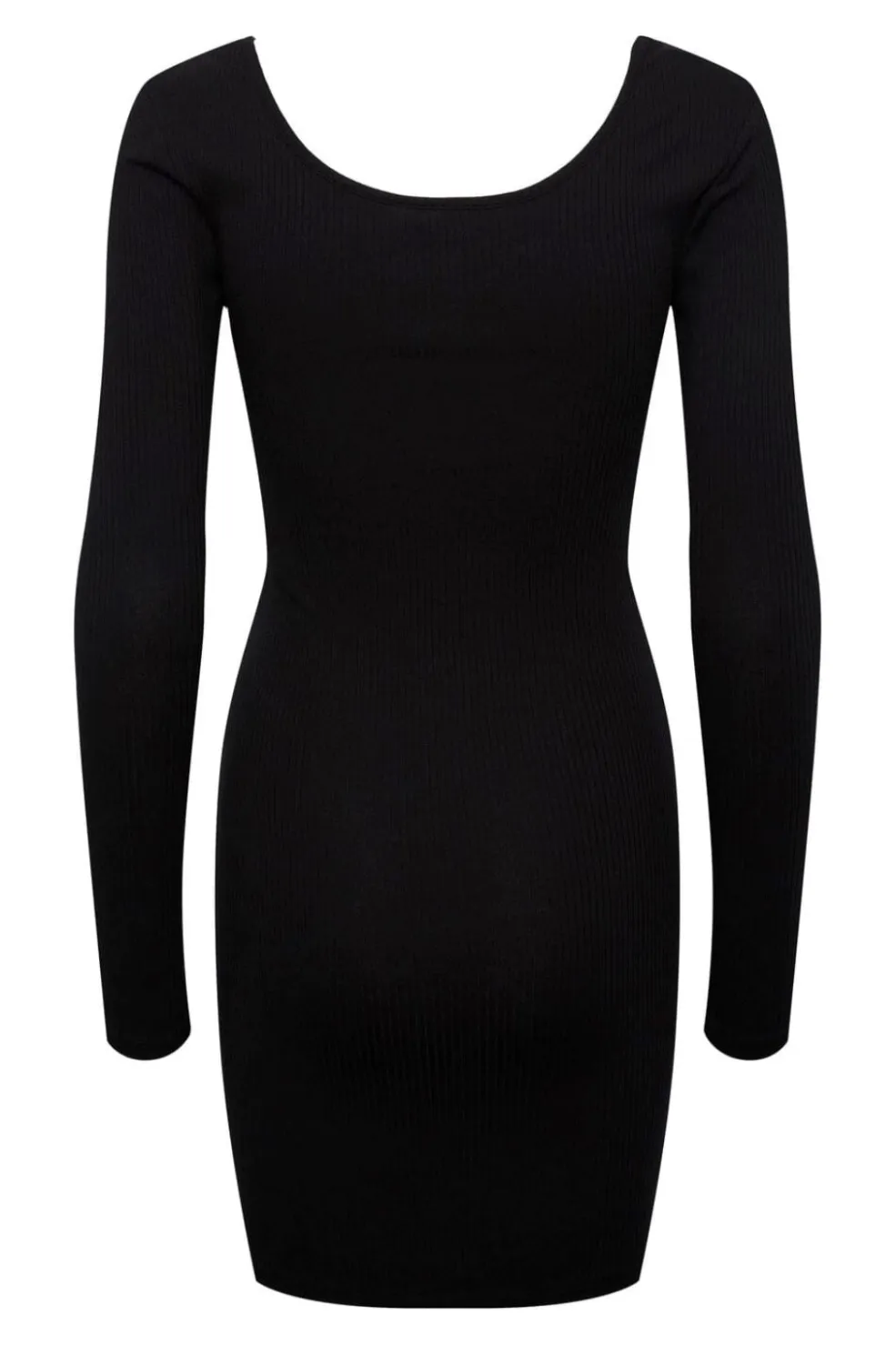 Sort kjole fra Pieces med ribbet tekstur og lårlængde. Kjolen har en kropsnær silhuet med lange ærmer og rund halsudskæring med knapdetaljer ved brystet.
