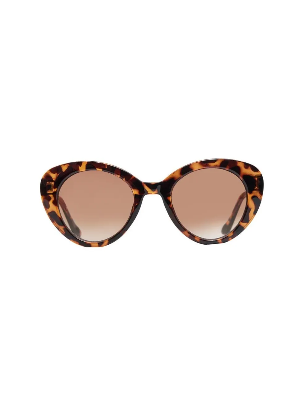 Solbriller fra Pieces med katteøje-form og skildpaddemønster. Stellet har brune gradientlinser og kommer med en opbevaringsboks til beskyttelse af brillerne.
