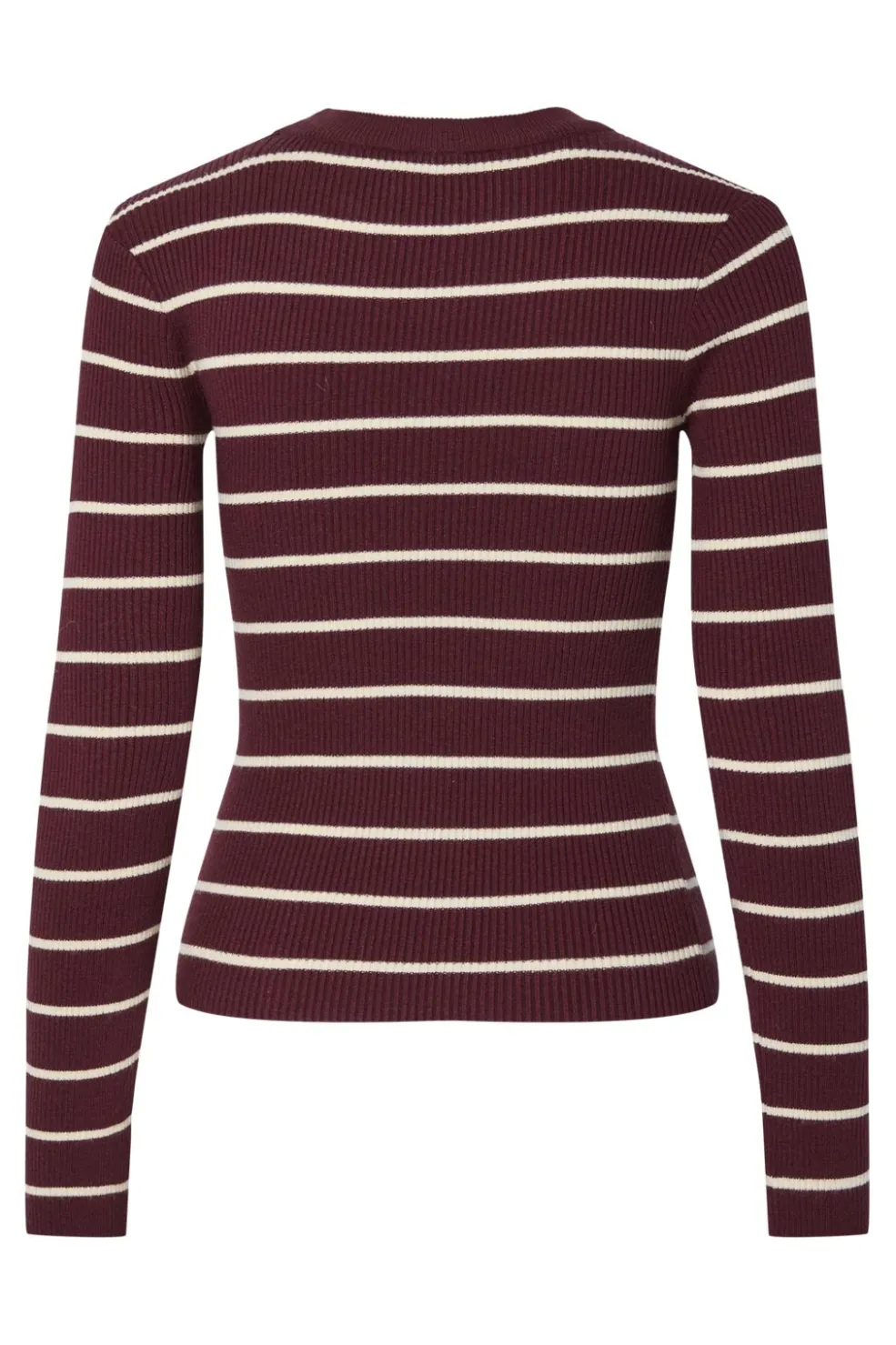 Stribet striktrøje fra Pieces i bordeauxrød med lyse striber. En tætsiddende model med rund hals og lange ærmer i en blød ribstrik.