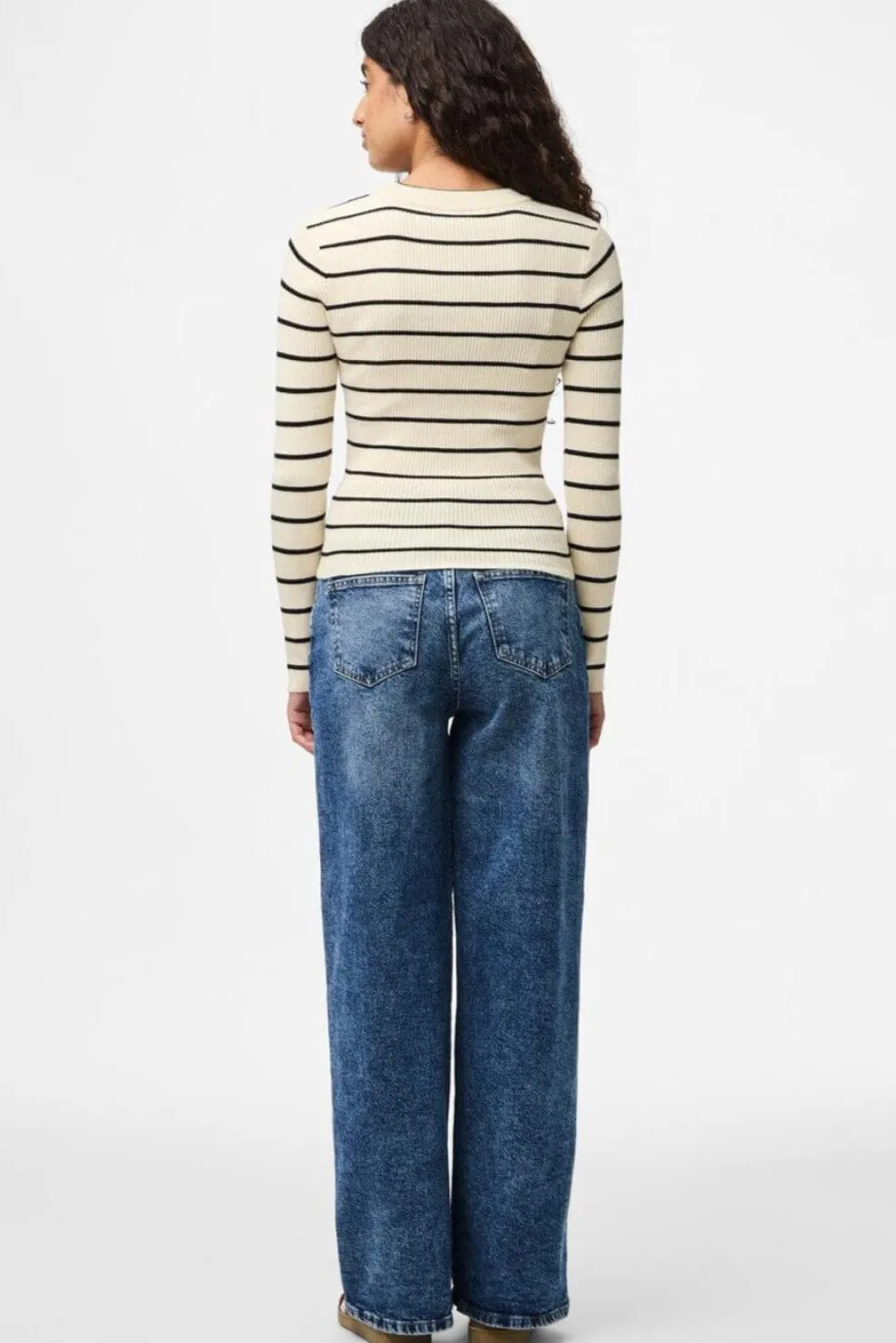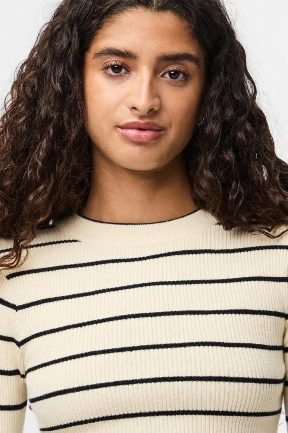 Stribet striktrøje fra Pieces med rund hals. Den lyse birkefarve har smalle sorte striber, og strikken har en tætsiddende pasform med ribbet tekstur.