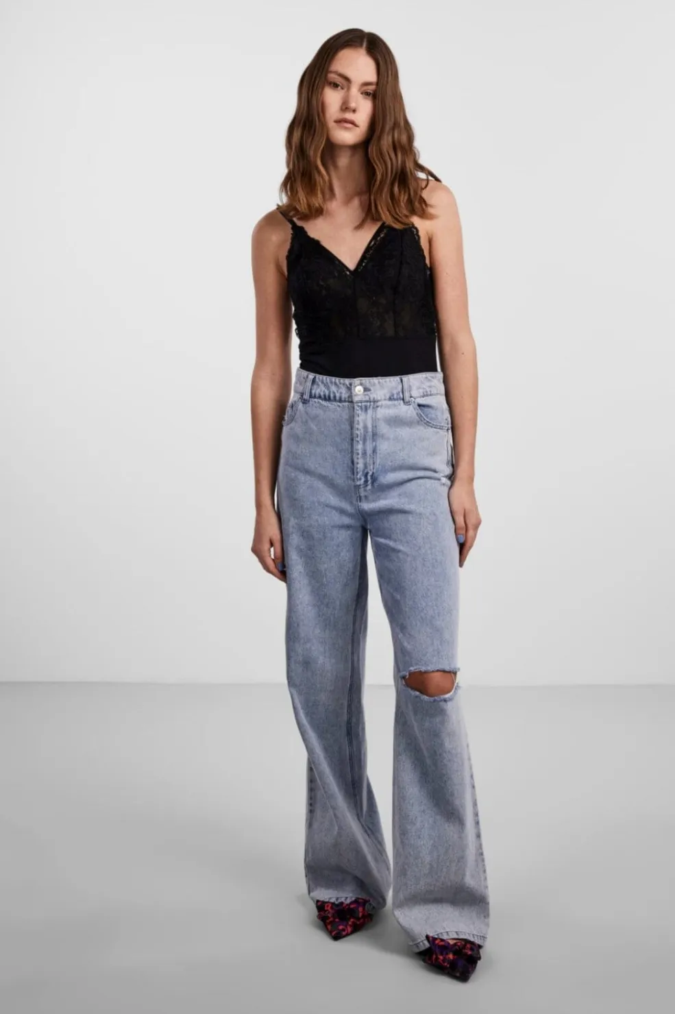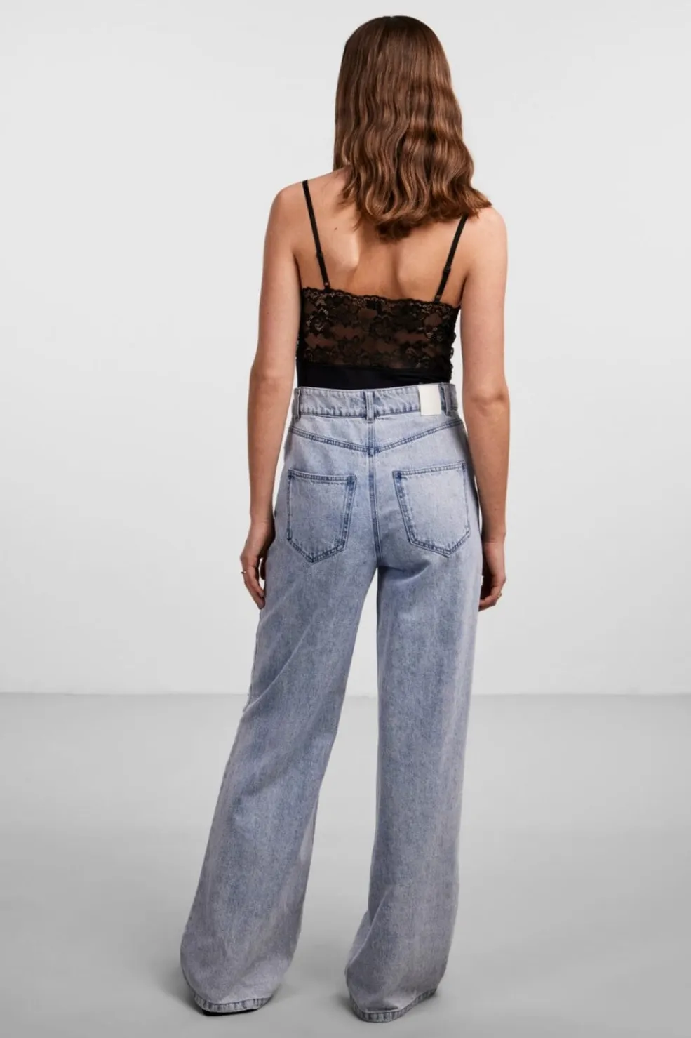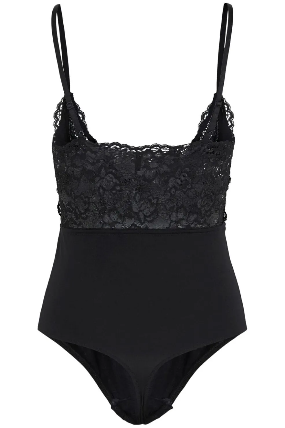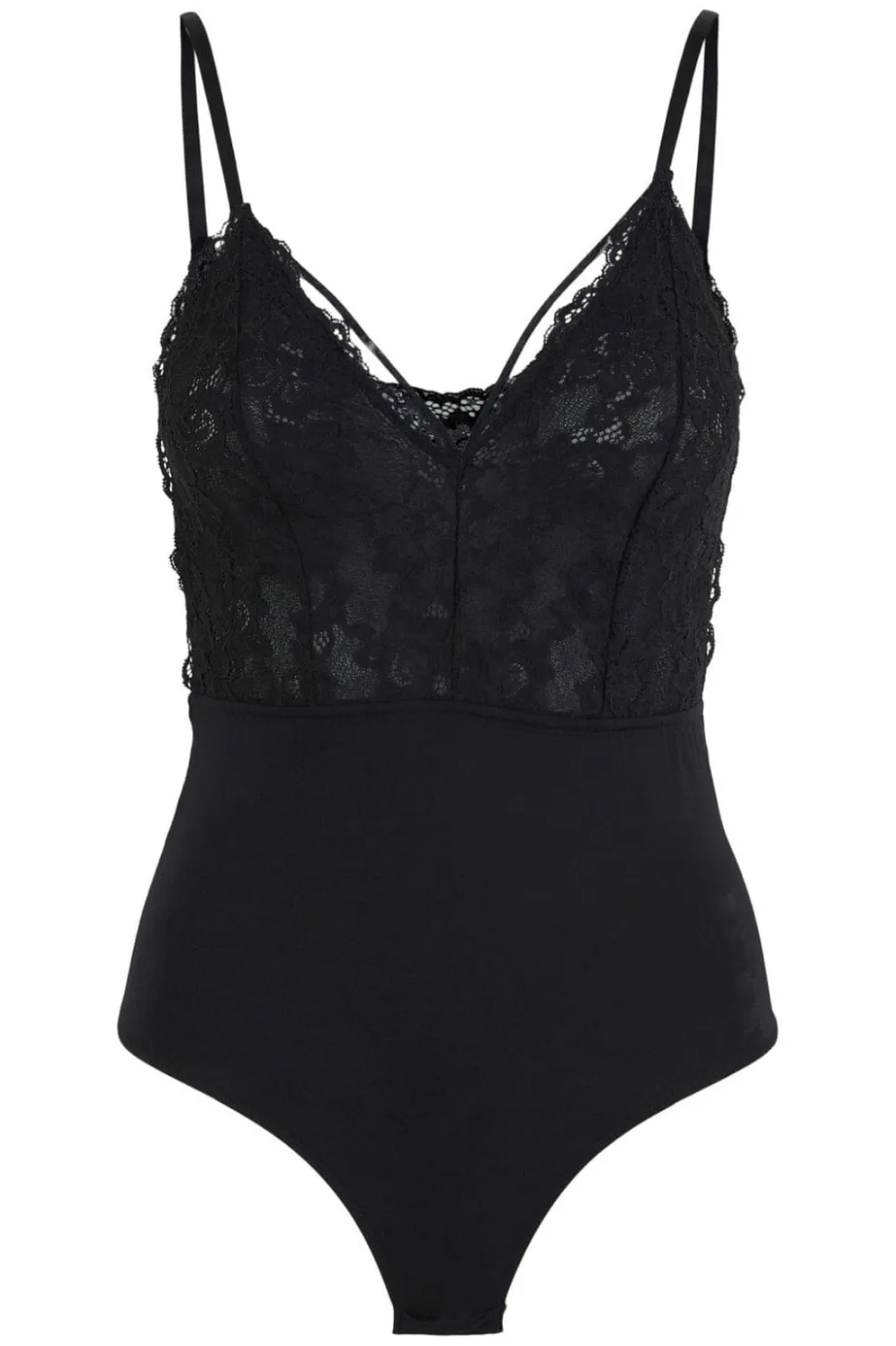 Sort bodystocking fra Pieces med blondedetaljer i overdelen. Designet med tynde spaghettistropper og V-halsudskæring. Den hoftekorte længde gør den let at style med forskellige bunde.