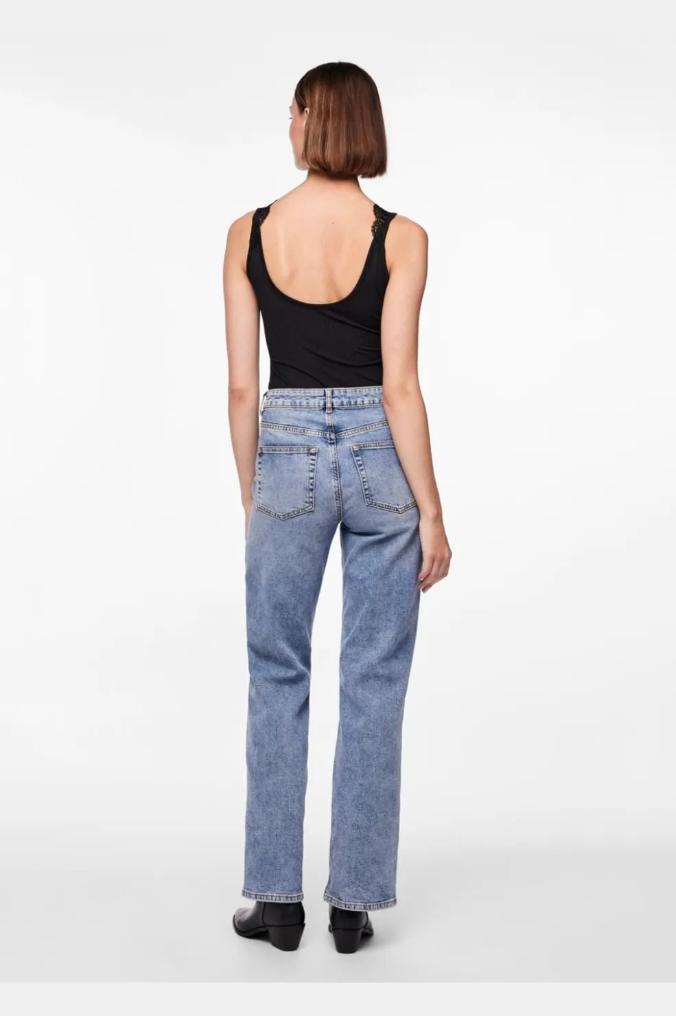 Sort bodystocking fra Pieces med ribbet tekstur og blondedetaljer. Den dybe V-udskæring har en markant blondekant, og designet har et thong-snit i bunden.