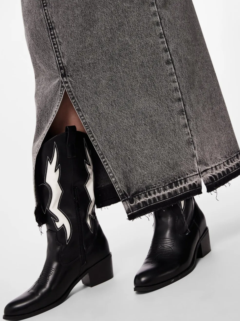 Grå denimnederdel fra Pieces med ankellængde. Nederdelen har en slids foran og en normal talje med lynlås og knaplukning.