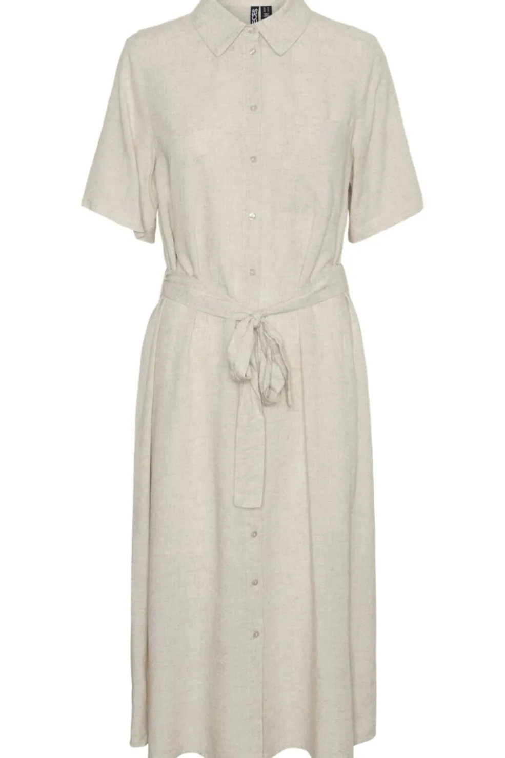 Skjortekjole fra Pieces i lys beige. Kjolen har knaplukning foran, skjortekrave og korte ærmer. Et bindebånd i taljen giver mulighed for at tilpasse pasformen.
