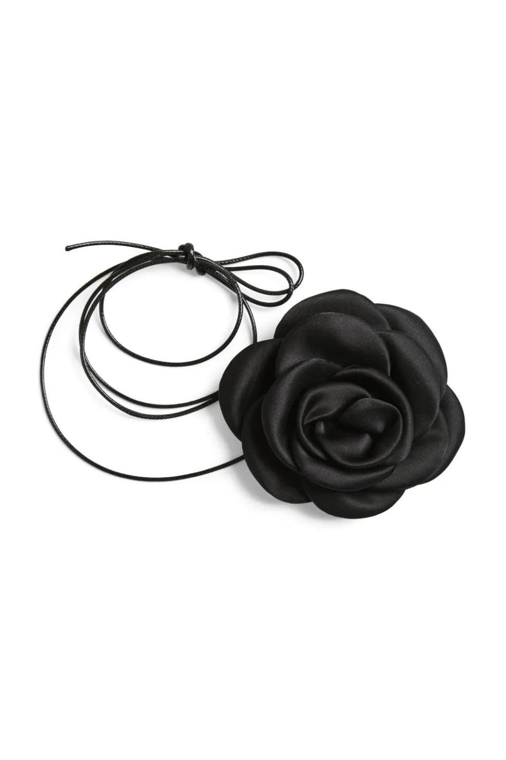 Sort choker fra Pieces med en stor rose i stof. Halskæden har en justerbar snor og et lagdelt blomsterdesign, der giver et markant udtryk.