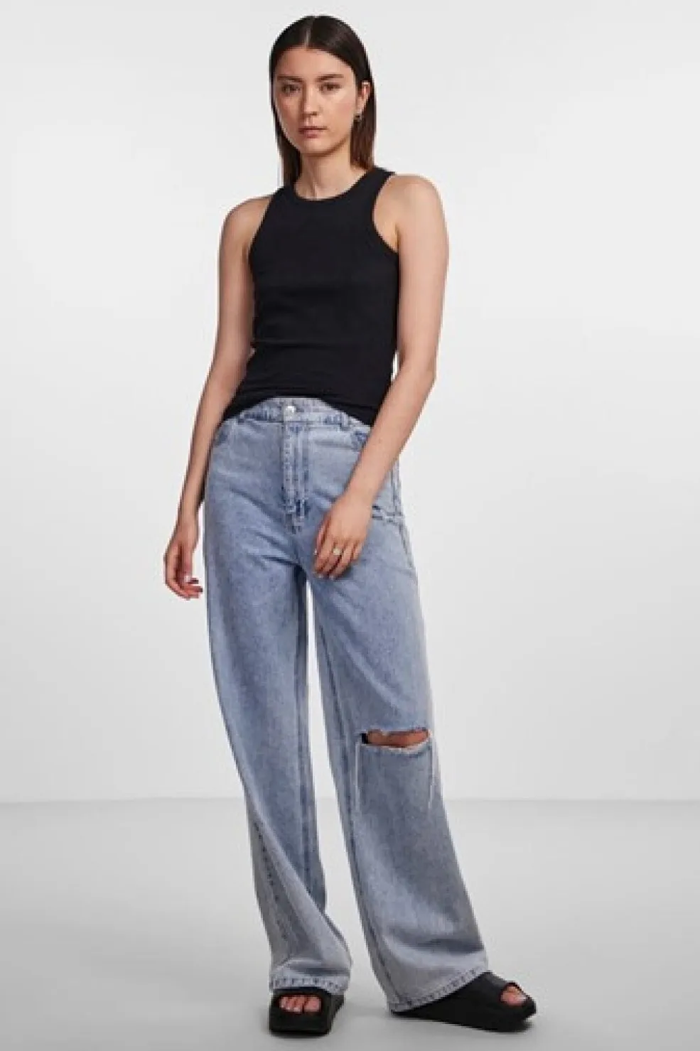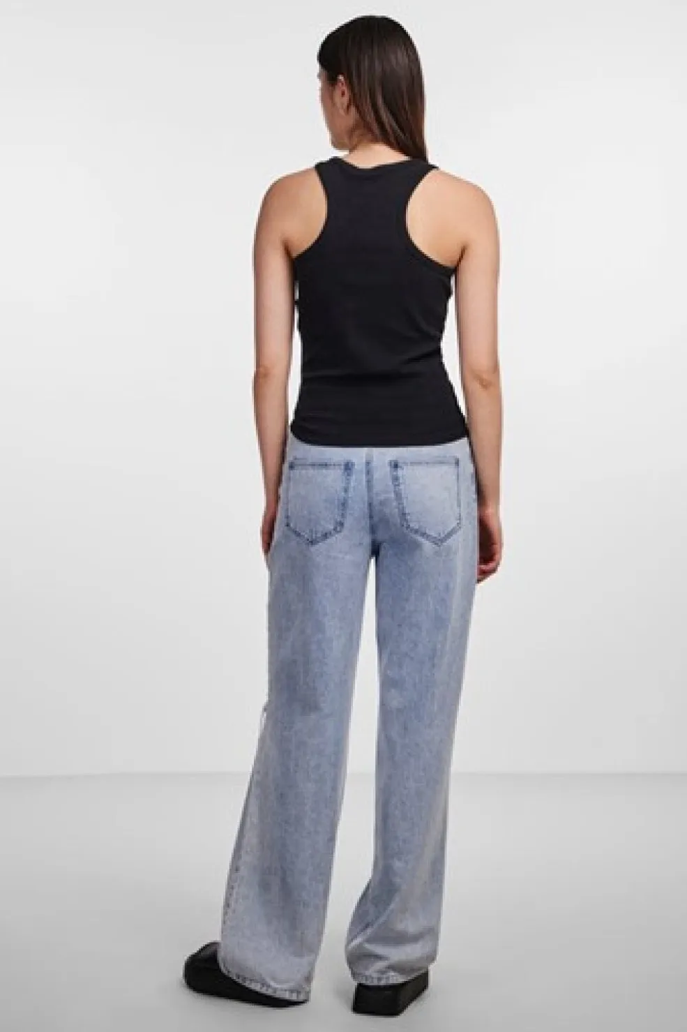 Sort tanktop fra Pieces med brede stropper og ribbet tekstur. Den har en rund halsudskæring og en regular pasform, der giver god bevægelsesfrihed.