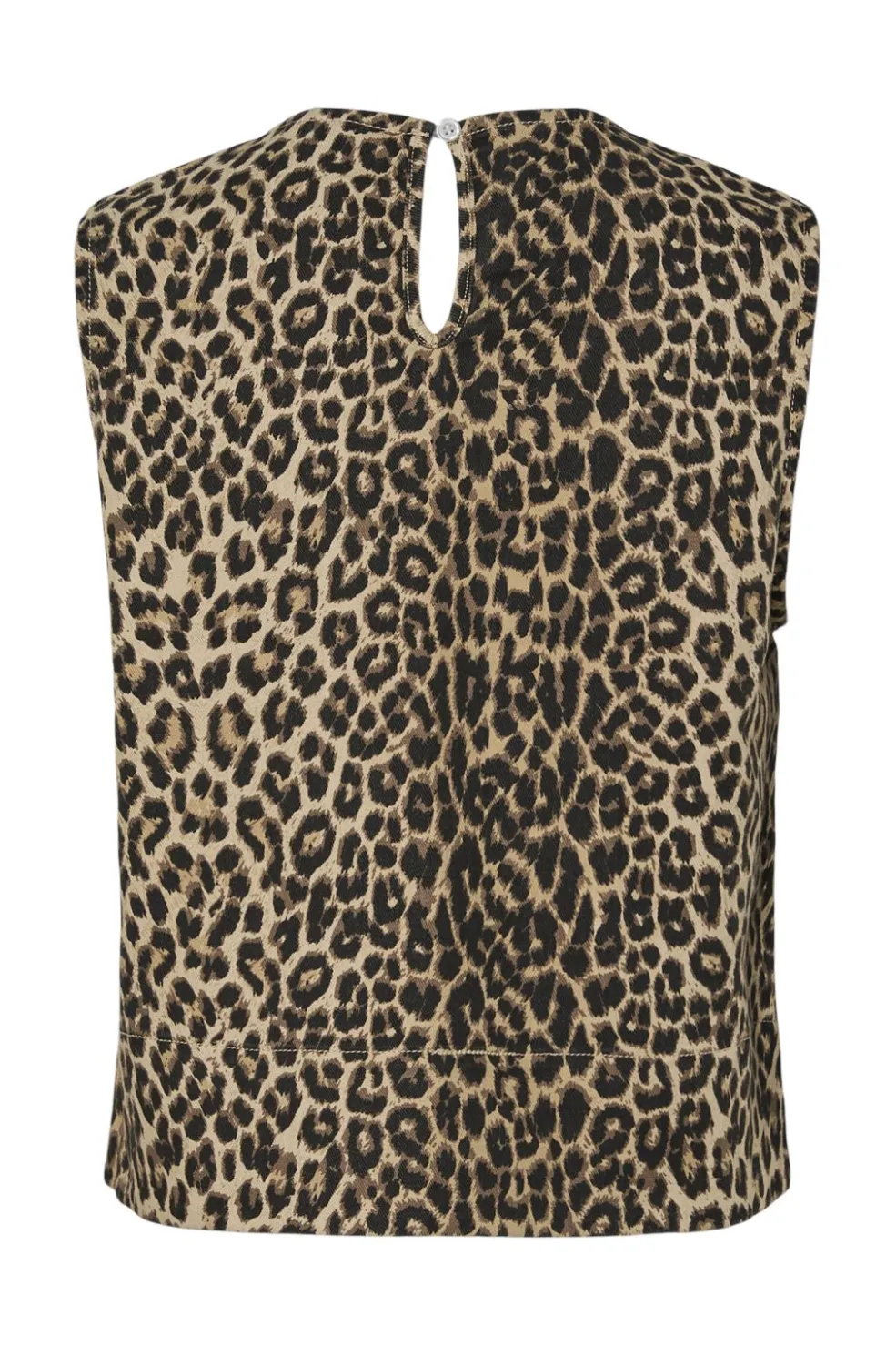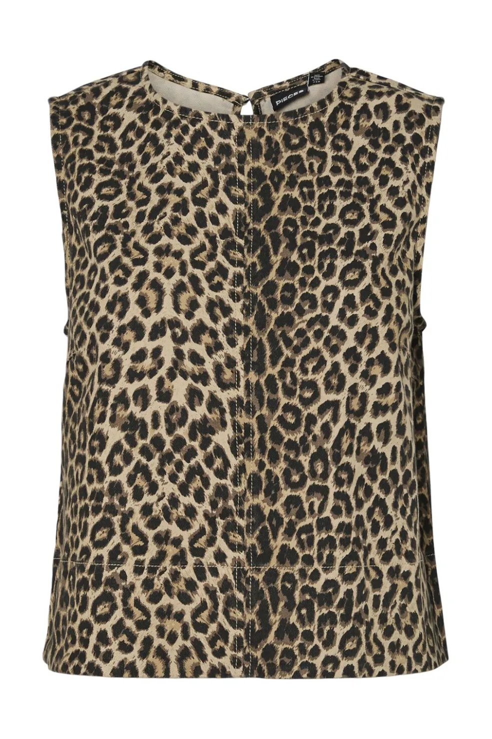 Ærmeløs top fra Pieces med leopardprint i beige og sorte nuancer. Toppen har en løs pasform og rund halsudskæring med en lille knaplukning i nakken.