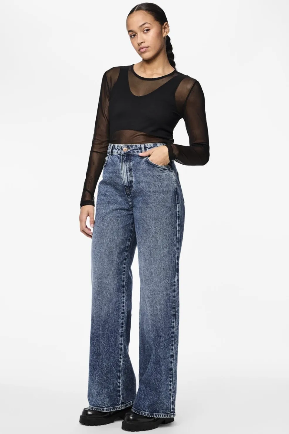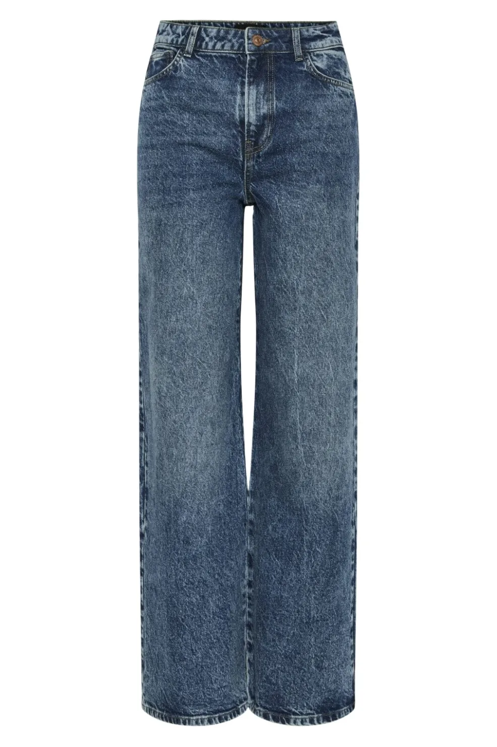 Mellemblå wide leg jeans fra Pieces med høj talje og løs pasform. De brede bukseben og acid wash giver jeansene et afslappet udtryk.
