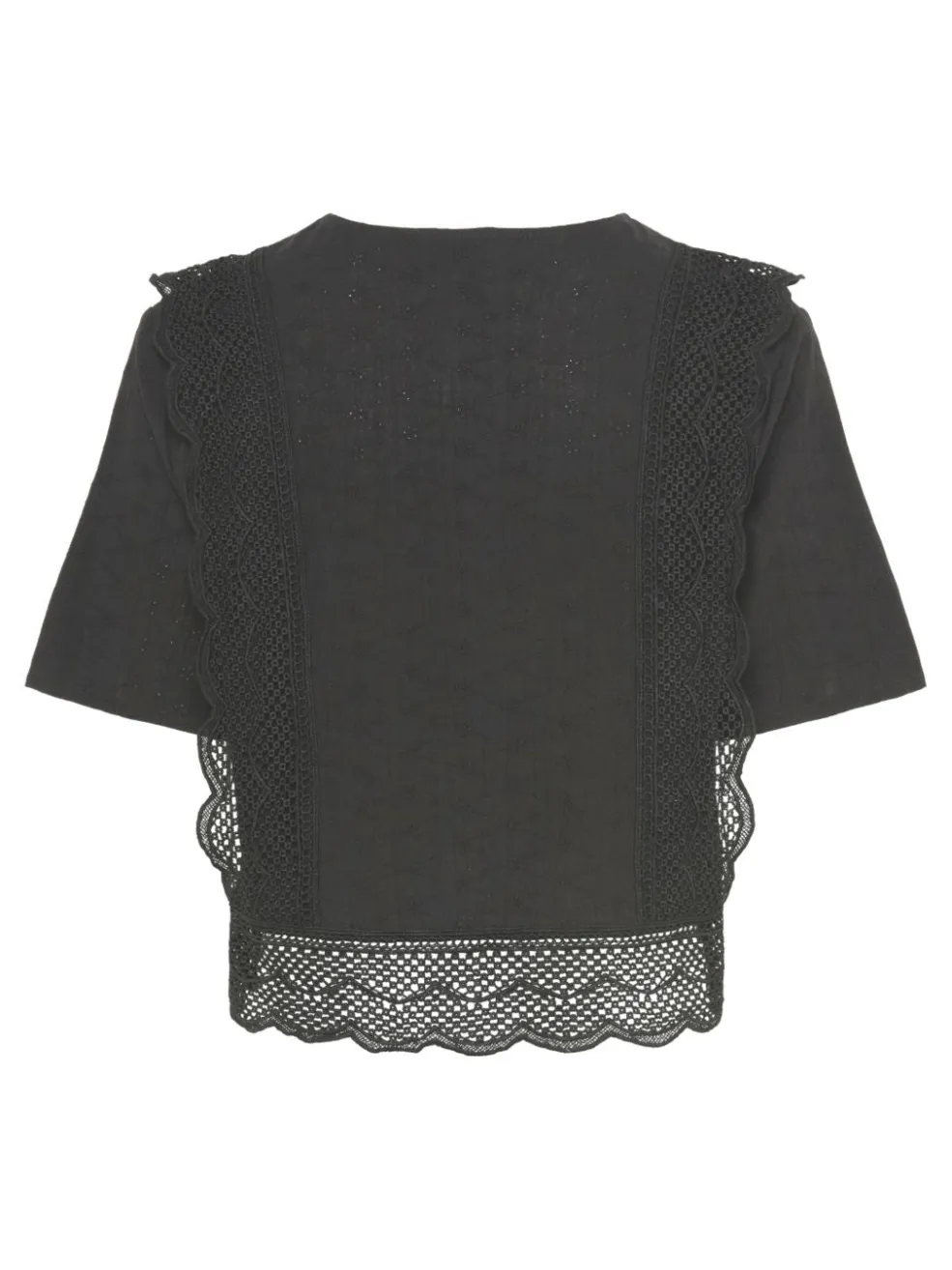 Sort top fra Pieces med knapper og blondedetaljer. Toppen har en rund halsudskæring og korte ærmer. Blondekanten forneden giver toppen et blødt og feminint udtryk.