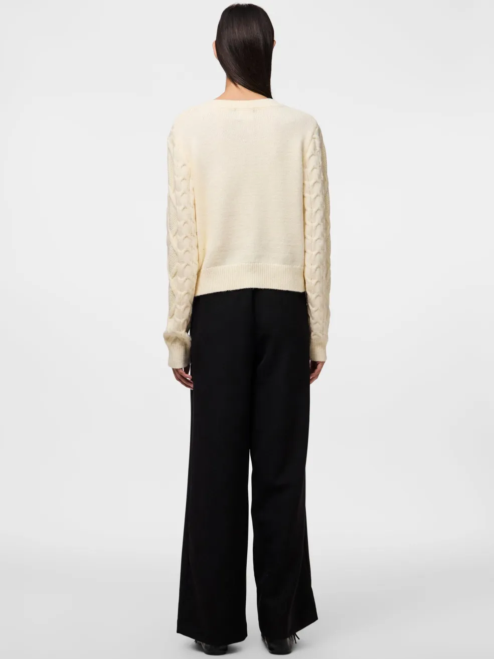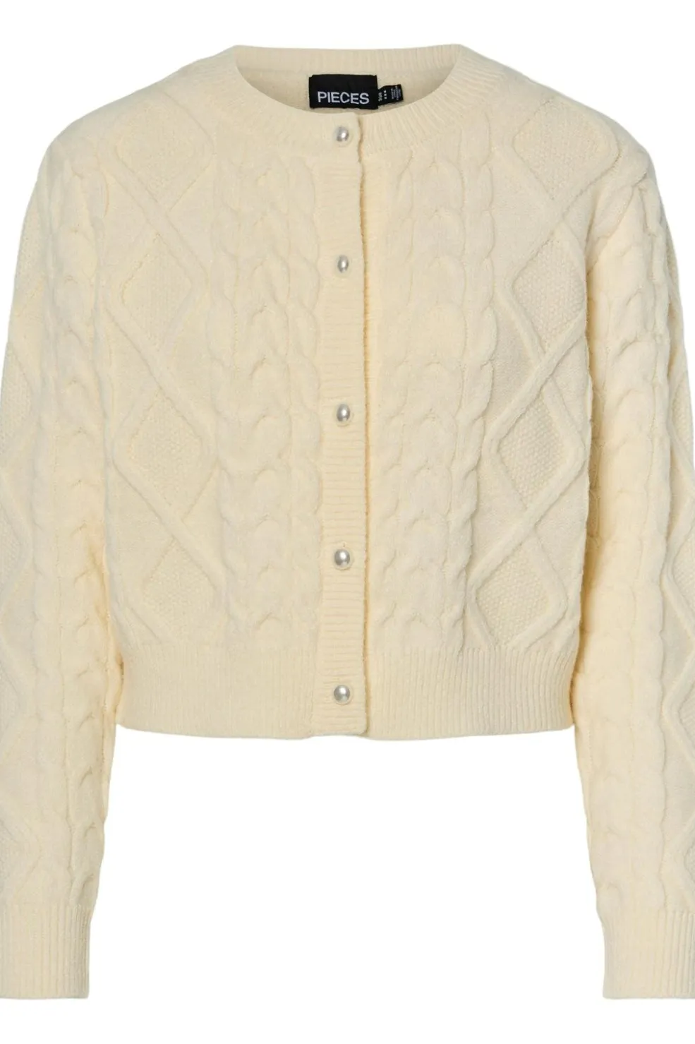 Cremehvid cardigan fra Pieces med kabelstrikmønster og perledetaljer. Cardiganen har rund halsudskæring, knaplukning foran og lange ærmer.