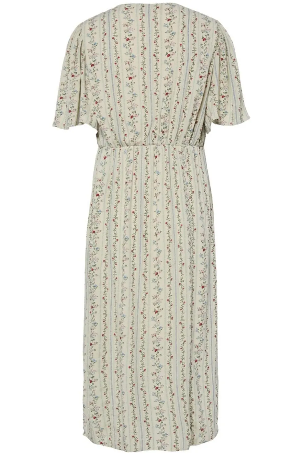 Midi-kjole fra Pieces med korte ærmer og V-hals. Kjolen har et mønster med små røde og blå blomster på lys baggrund, kombineret med lodrette striber.