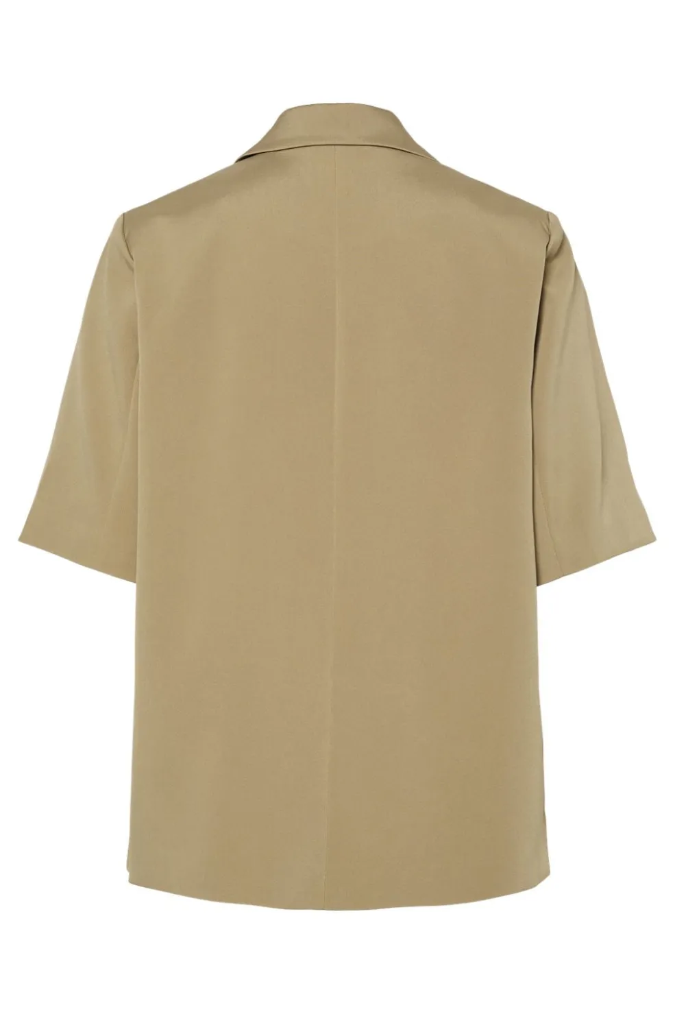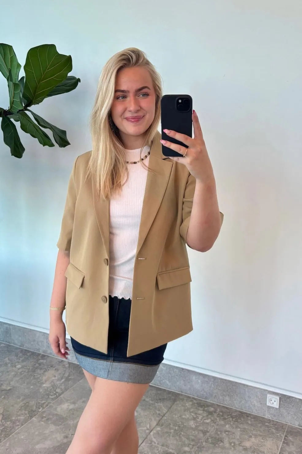 Blazer fra Pieces i farven Elmwood med korte ærmer og knaplukning. Den har en regular fit og spredt krave. Designet med praktiske sidelommer og en neutral farve, der passer til mange outfits.