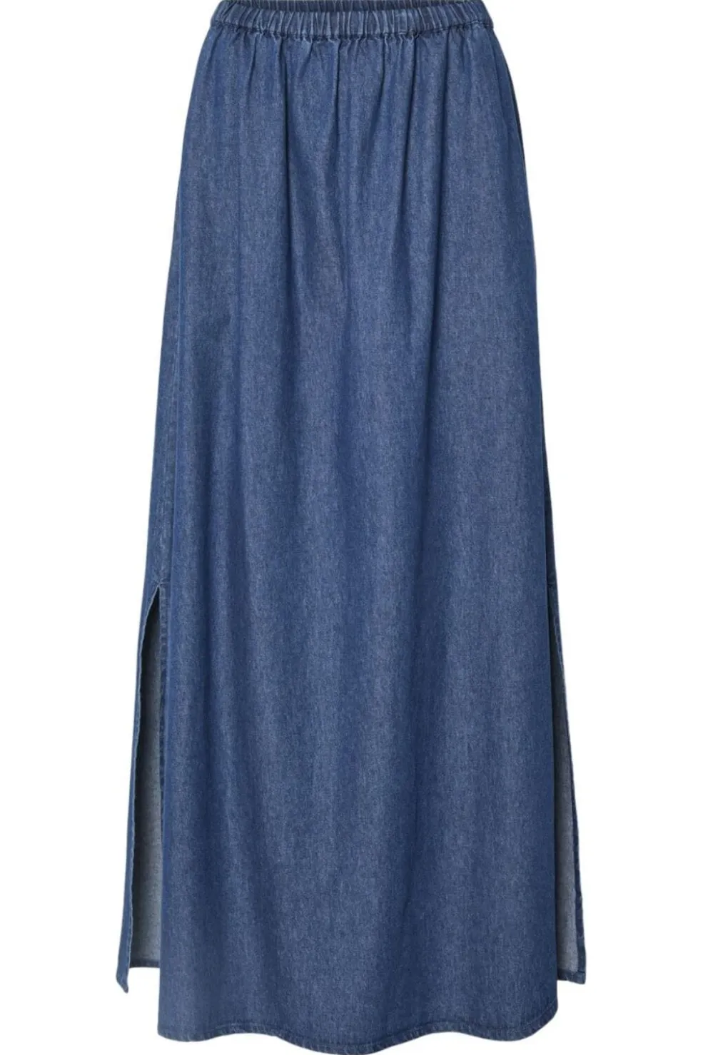 Maxi-nederdel fra Pieces i medium blå denim. Den lange nederdel har en elastisk talje og slidser i siderne, der giver god bevægelsesfrihed.