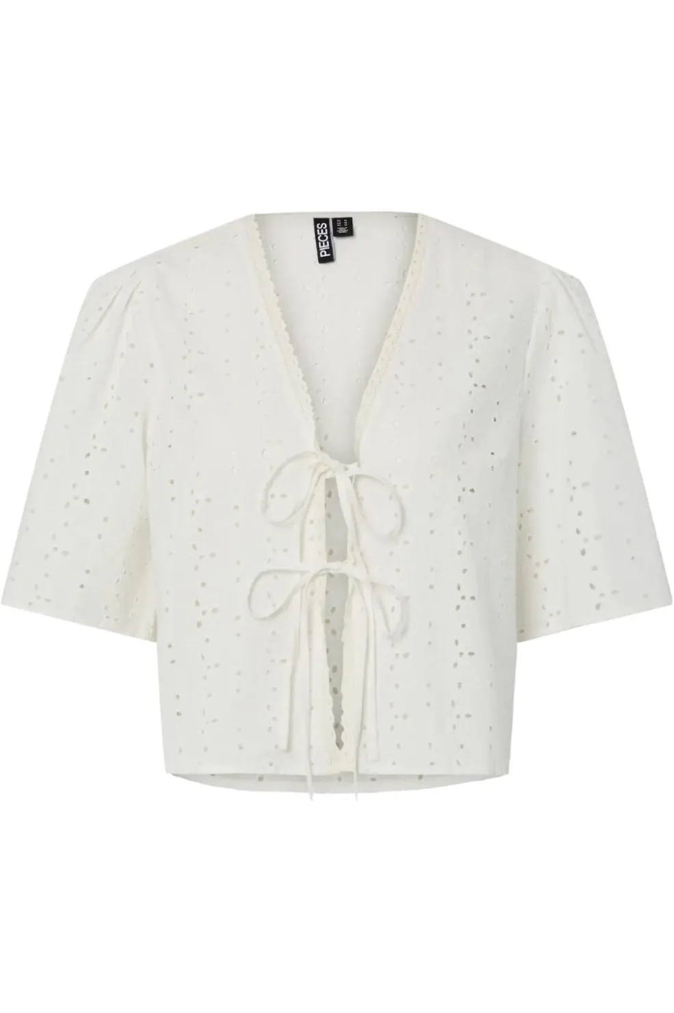 Hvid top fra Pieces i Broderie Anglaise med V-udskæring og bindebånd. Toppen har fine udskæringer i stoffet og 2/4-ærmer med let volumen. Fremstillet i farven Cloud Cream.