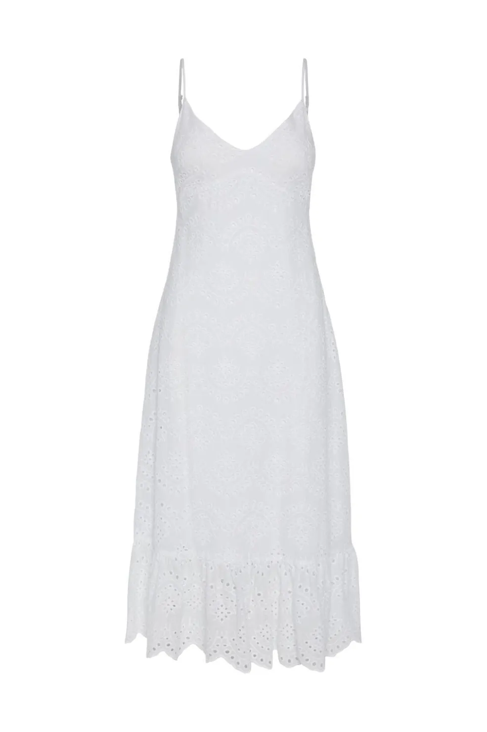 Hvid kjole fra Pieces i Broderie Anglaise-stof med udskæringer. Kjolen har tynde stropper og en V-halsudskæring, der går ned til en læg knælængde med flæsekant.