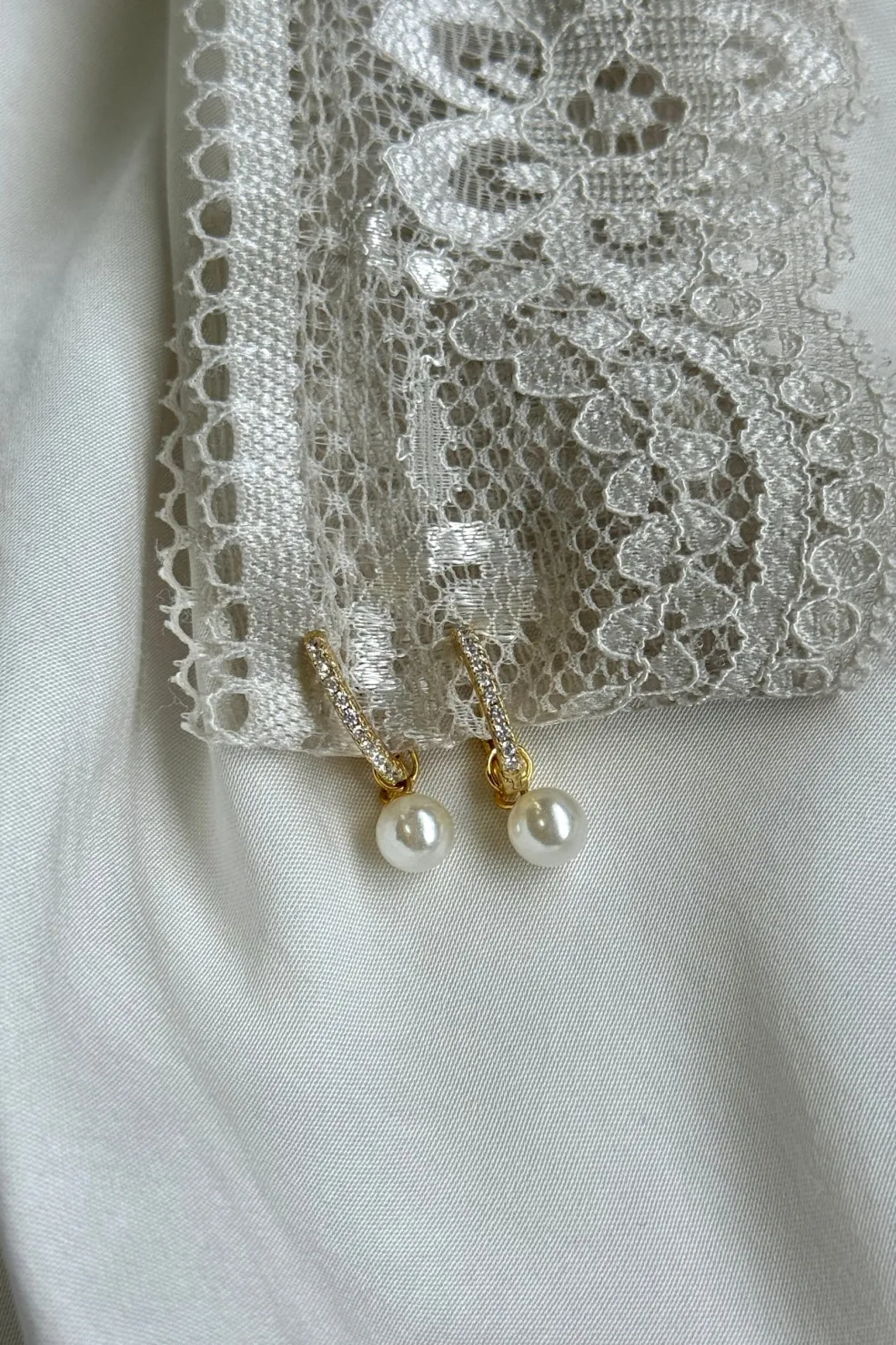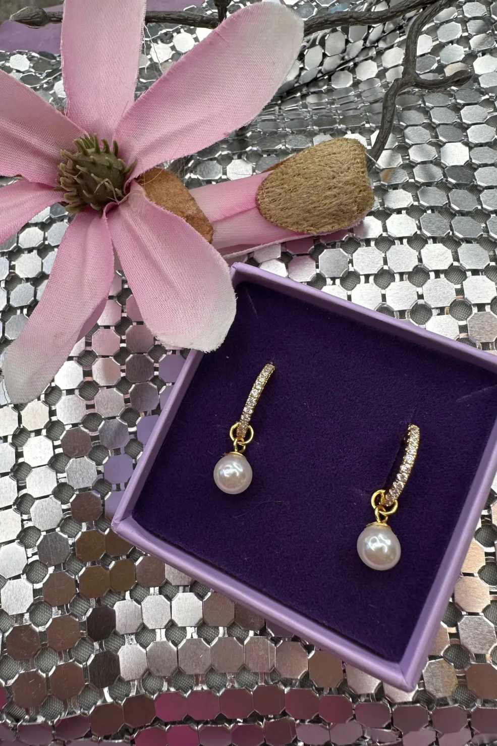 Forgyldte øreringe fra Mellow Moon med hvide perler og små sten. Øreringene har en buet form med glitrende sten langs kanten og en perle i bunden.