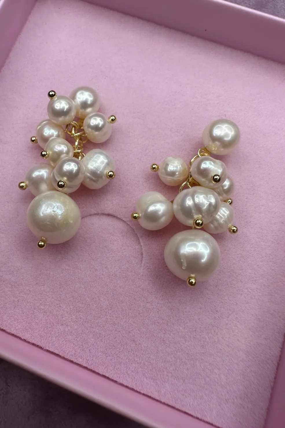 Øreringe fra Mellow Moon med klynger af perler i forskellige størrelser. De forgyldte detaljer i messing forbinder perlerne i et let og bevægeligt design.