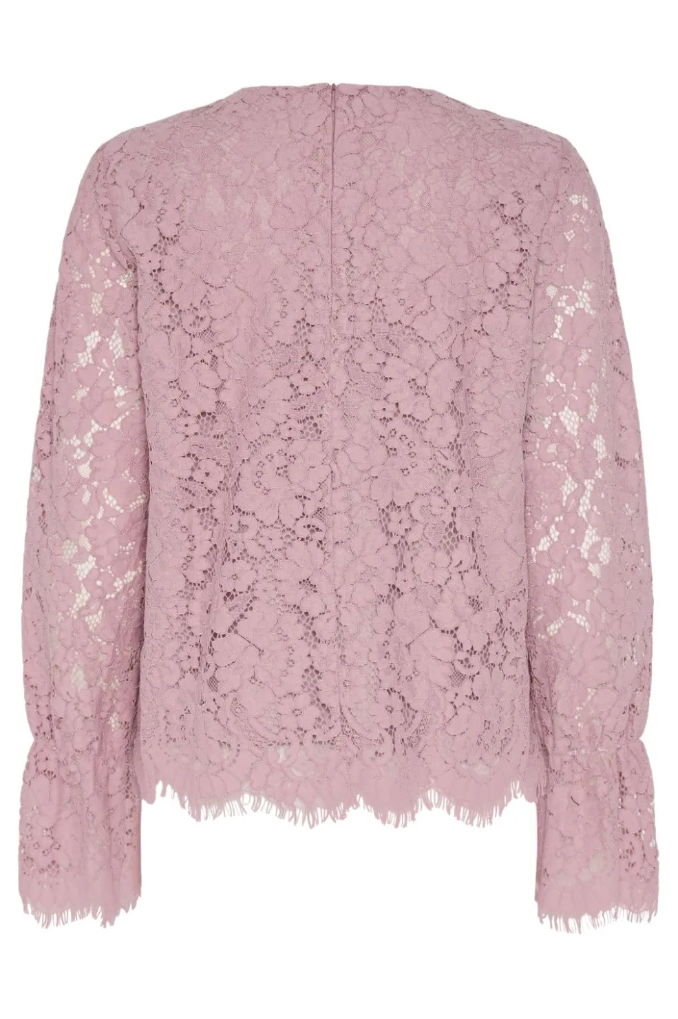Lyserød blondebluse fra Y. A.S med blomstermønster. Blusen har lange ærmer med frynset kant ved manchetterne og en rund halsudskæring.