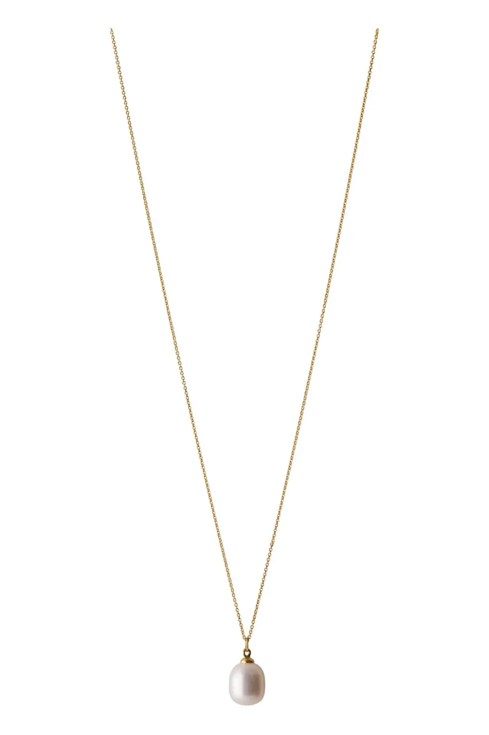 Guldbelagt halskæde fra Pernille Corydon Jewellery med en enkel kæde og en perle som vedhæng. Den enkle stil gør det nemt at kombinere med andre smykker.