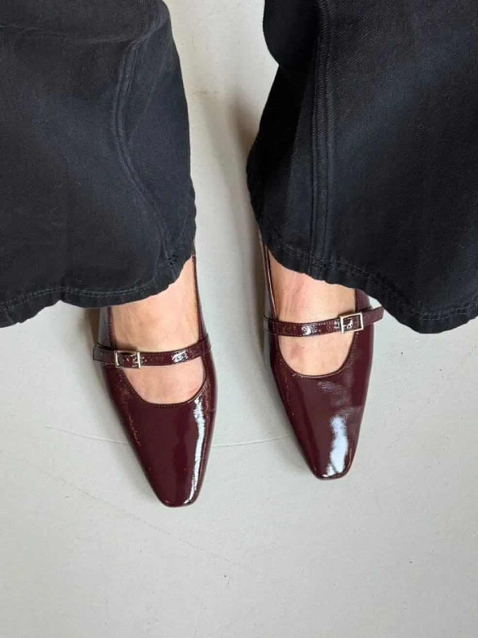 Ballerinaer fra Phenumb Copenhagen i bordo patentlæder. Skoen har en blank overflade, spids tå og lukning med spænde.