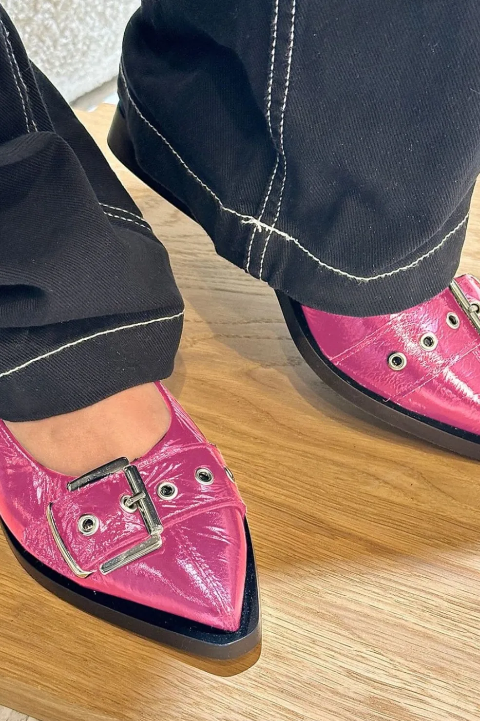 Pink sko fra Phenumb Copenhagen med spids tå og spændelukning. Skoen er lavet af læder og polyamid, hvilket gør den behagelig at gå i.