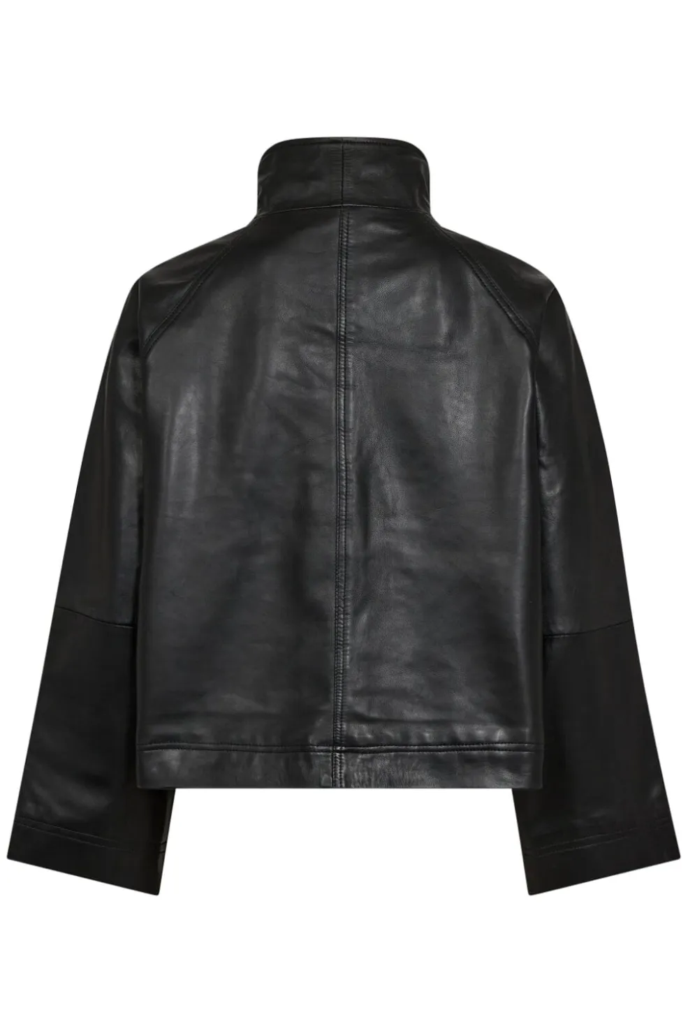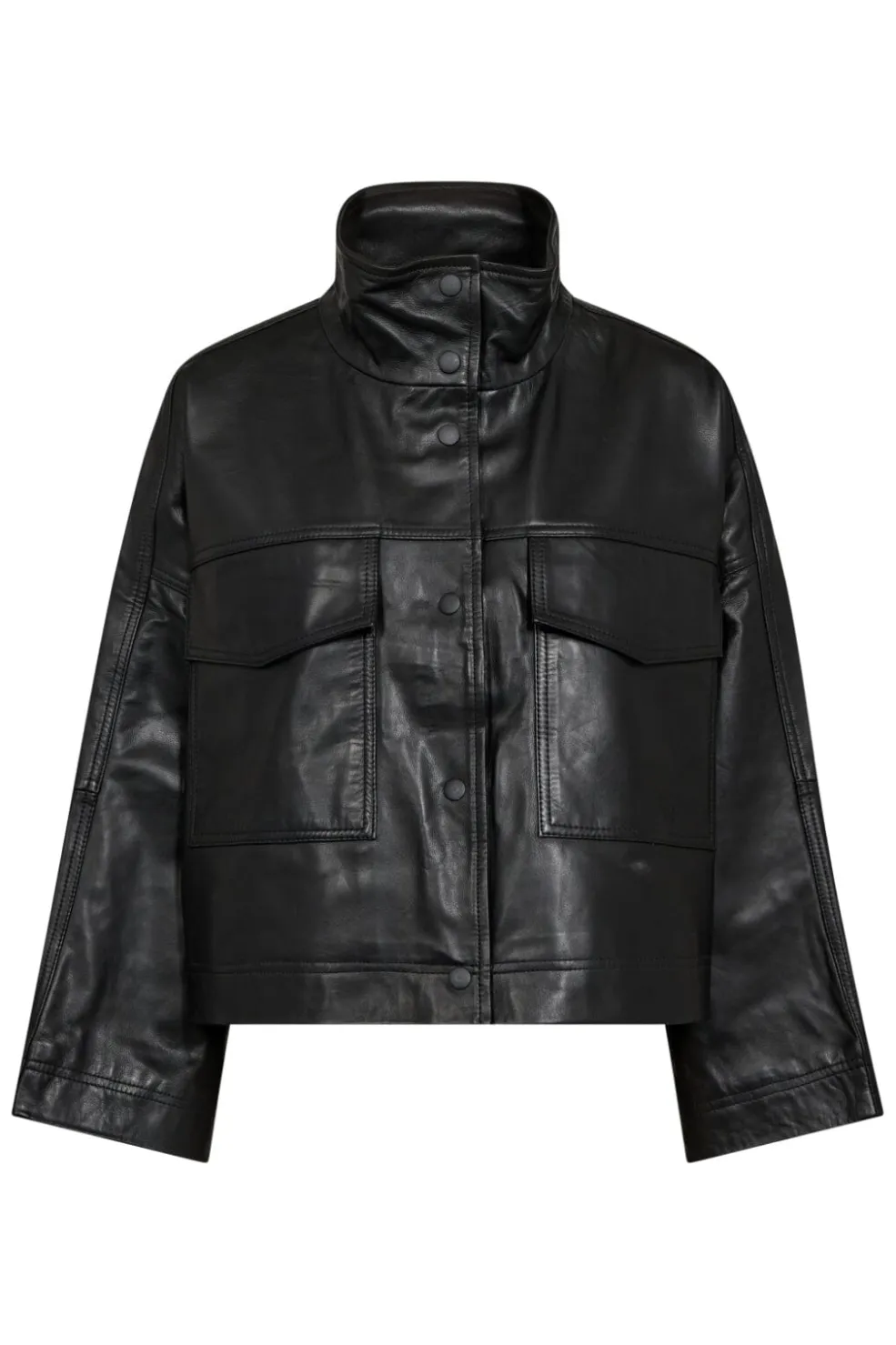 Sort læderjakke fra Co’couture med boxy snit og store frontlommer. Jakken har trykknapper og 3/4-ærmer med dekorative syninger langs kanterne.