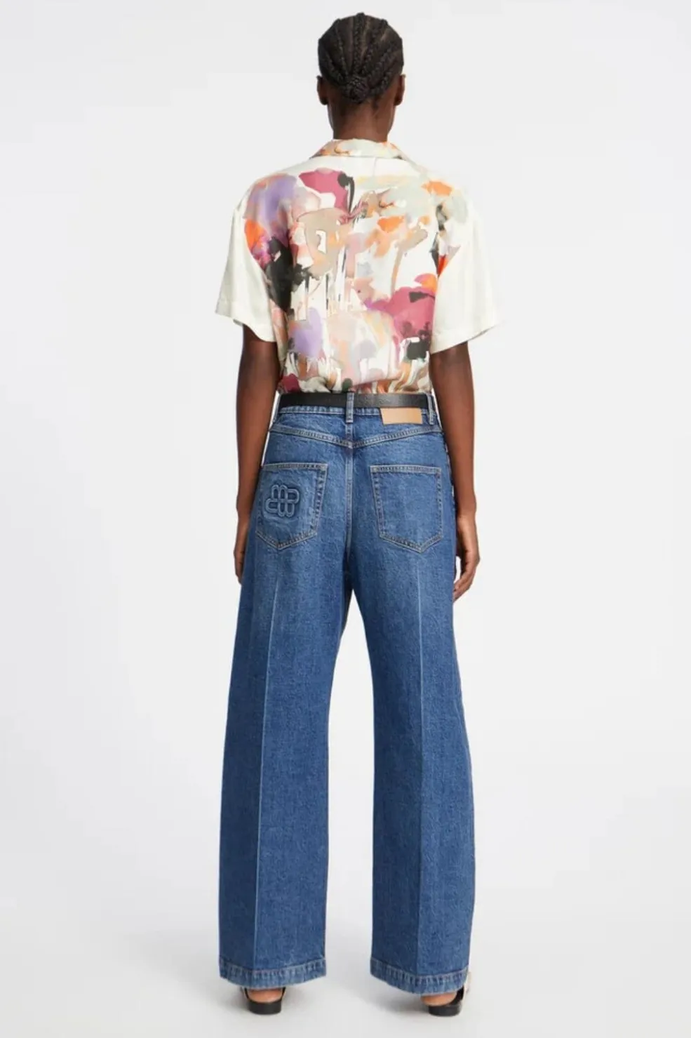 Sandfarvet skjorte fra Munthe med kunstnerisk blomsterprint i pink, orange og lilla nuancer. Skjorten har en løs pasform og er fremstillet i silke med korte ærmer og klassisk krave.