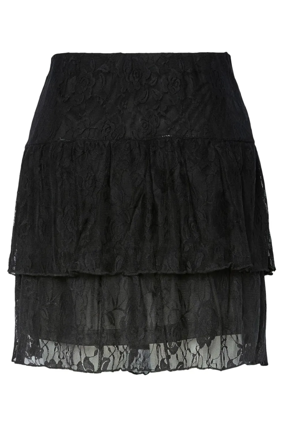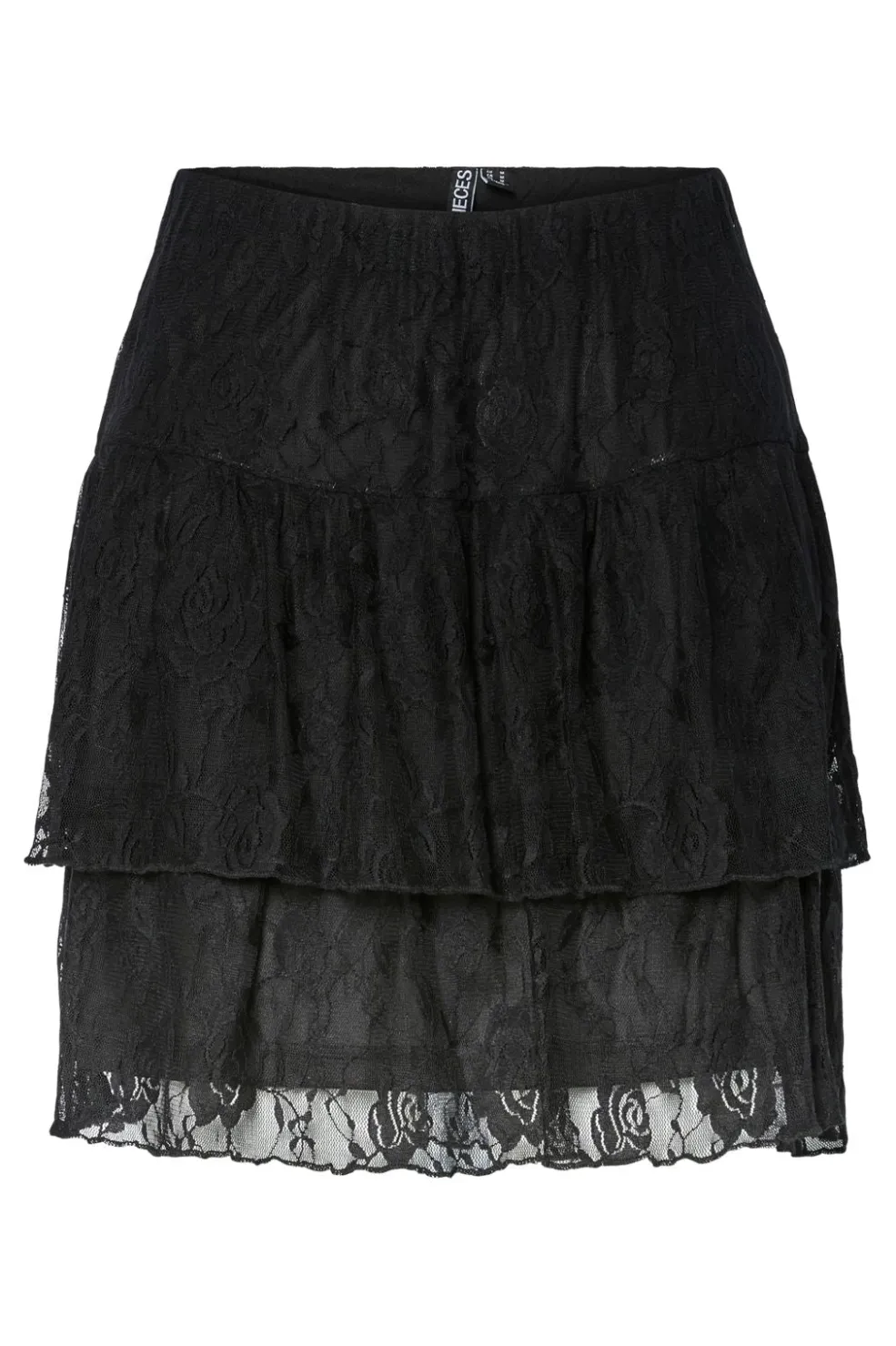Sort blondeskørt fra Pieces med tre lag blonder og blomstermønster. Skørtet har en lagdelt effekt med regulær talje og går til midt på låret.