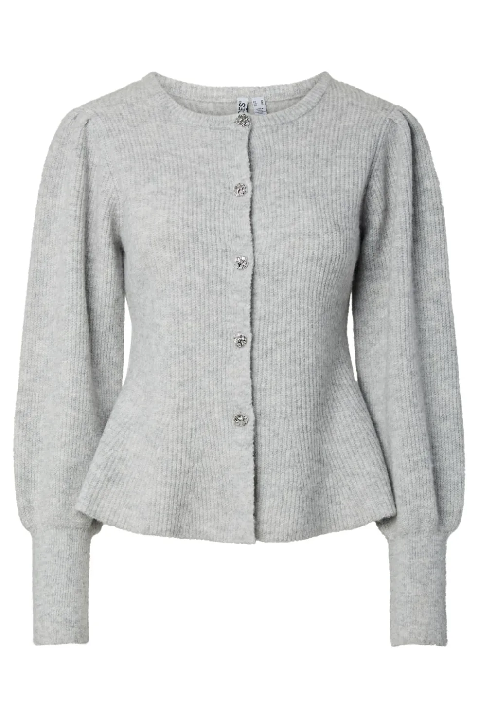Strikket cardigan fra Pieces i lysegrå meleret farve med peplumdetalje. Cardiganen har sølvfarvede knapper og dekorative ruffles langs kanten.