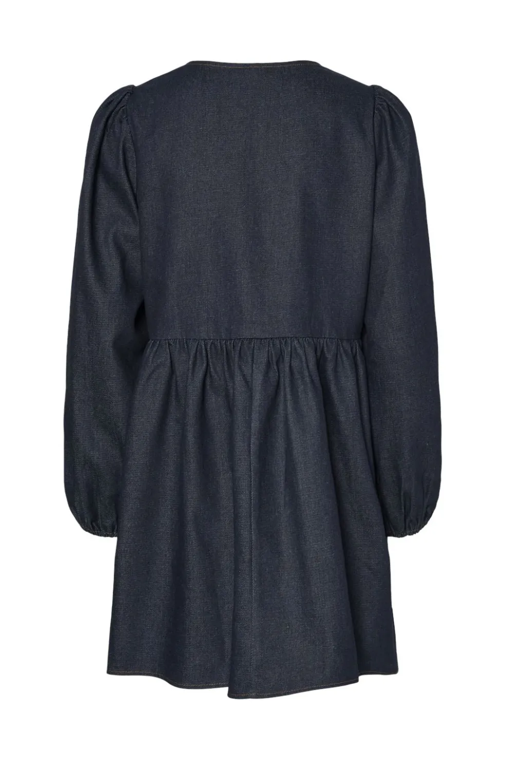 Denimkjole fra Pieces i mørkeblå ubehandlet denim. Kjolen har en rund halsudskæring med bindebånd og lange puffede ærmer.