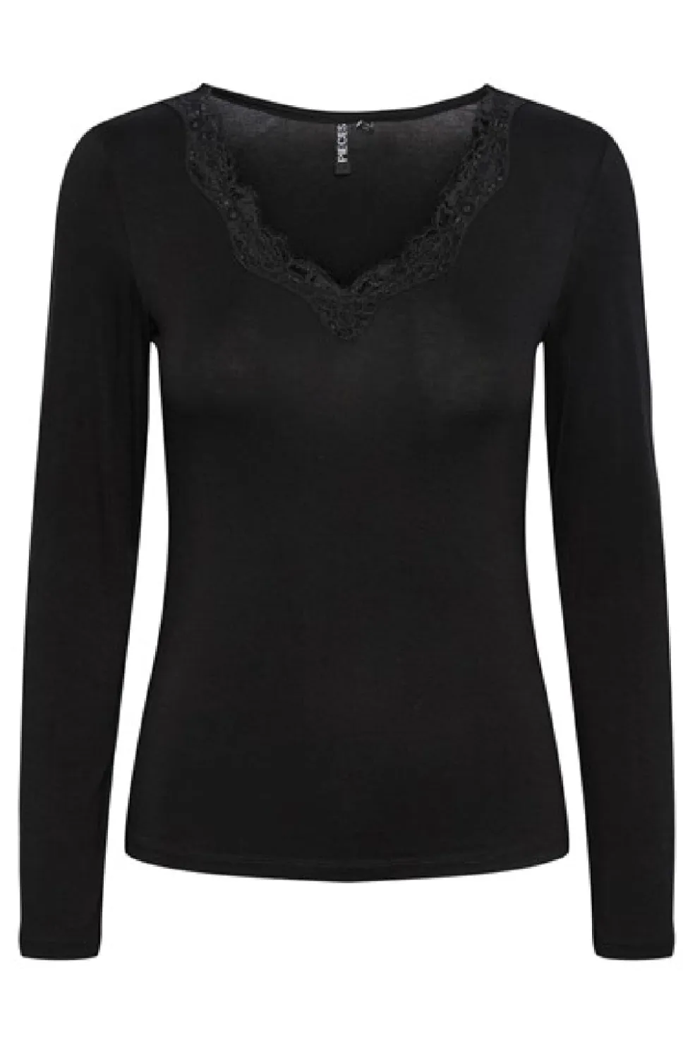 Sort langærmet bluse fra Pieces med blondedetaljer langs V-udskæringen. Blusen har en almindelig pasform og kan bruges til både hverdag og fest.