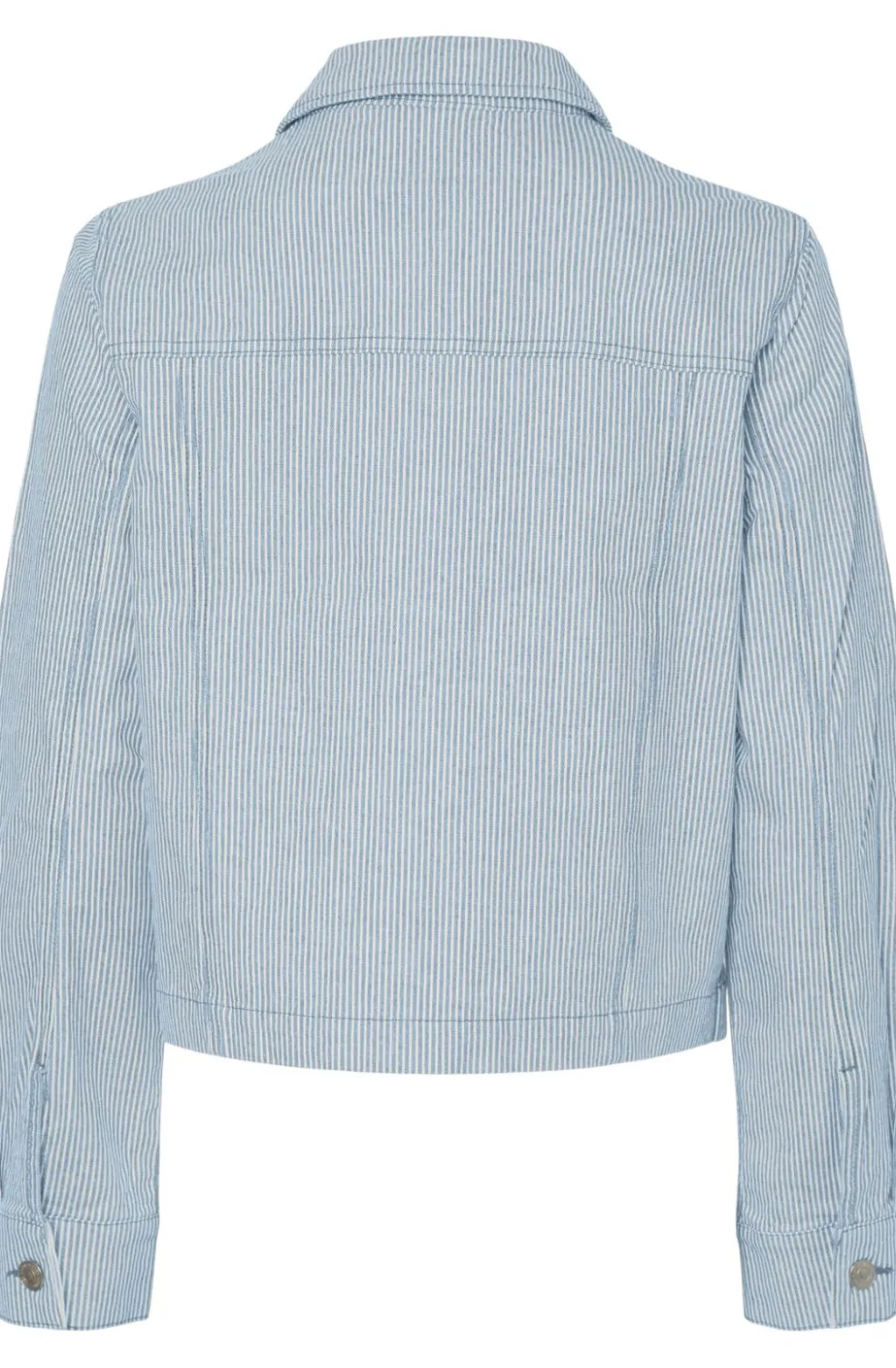 Lyseblå denimjakke fra Pieces med hvide striber. Jakken har skjortekrave, lange ærmer og trykknapper. Det stribede mønster giver et maritimt præg.