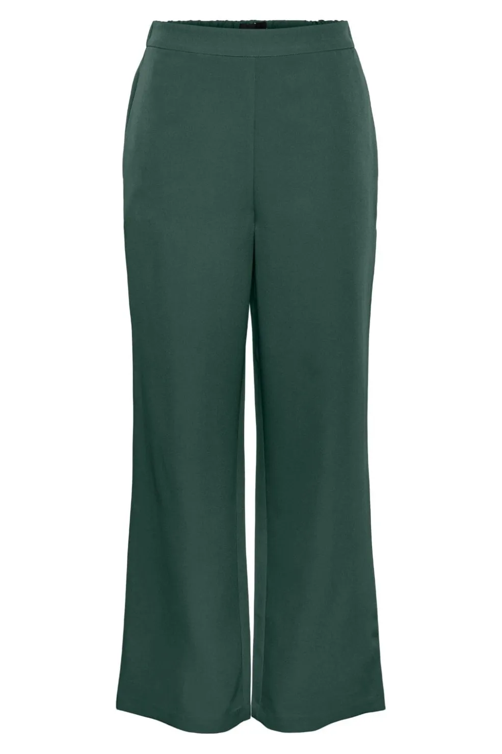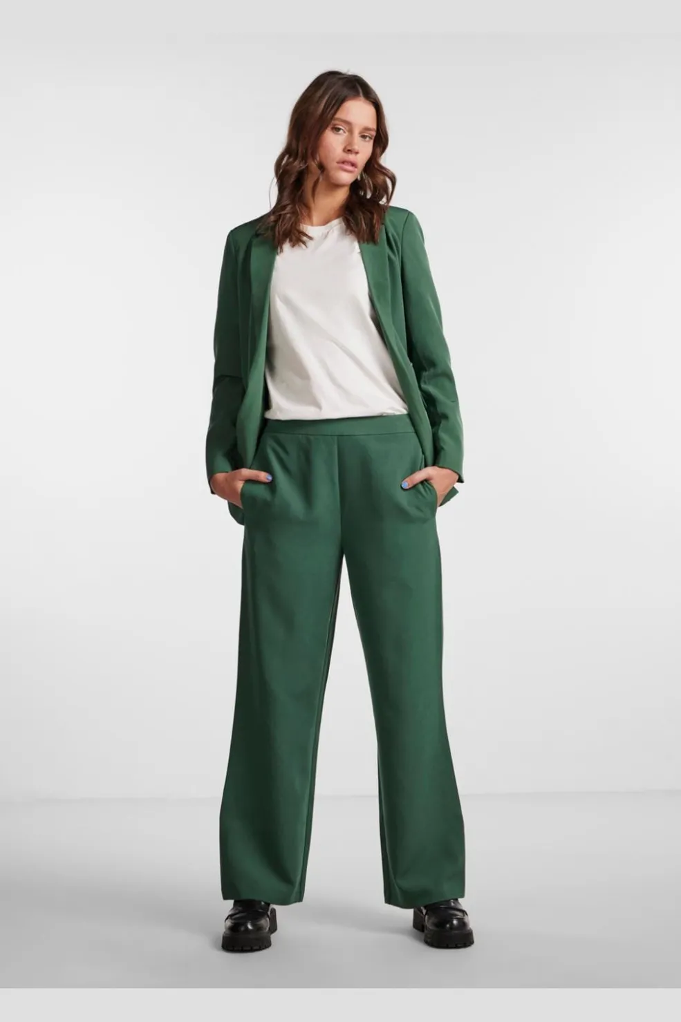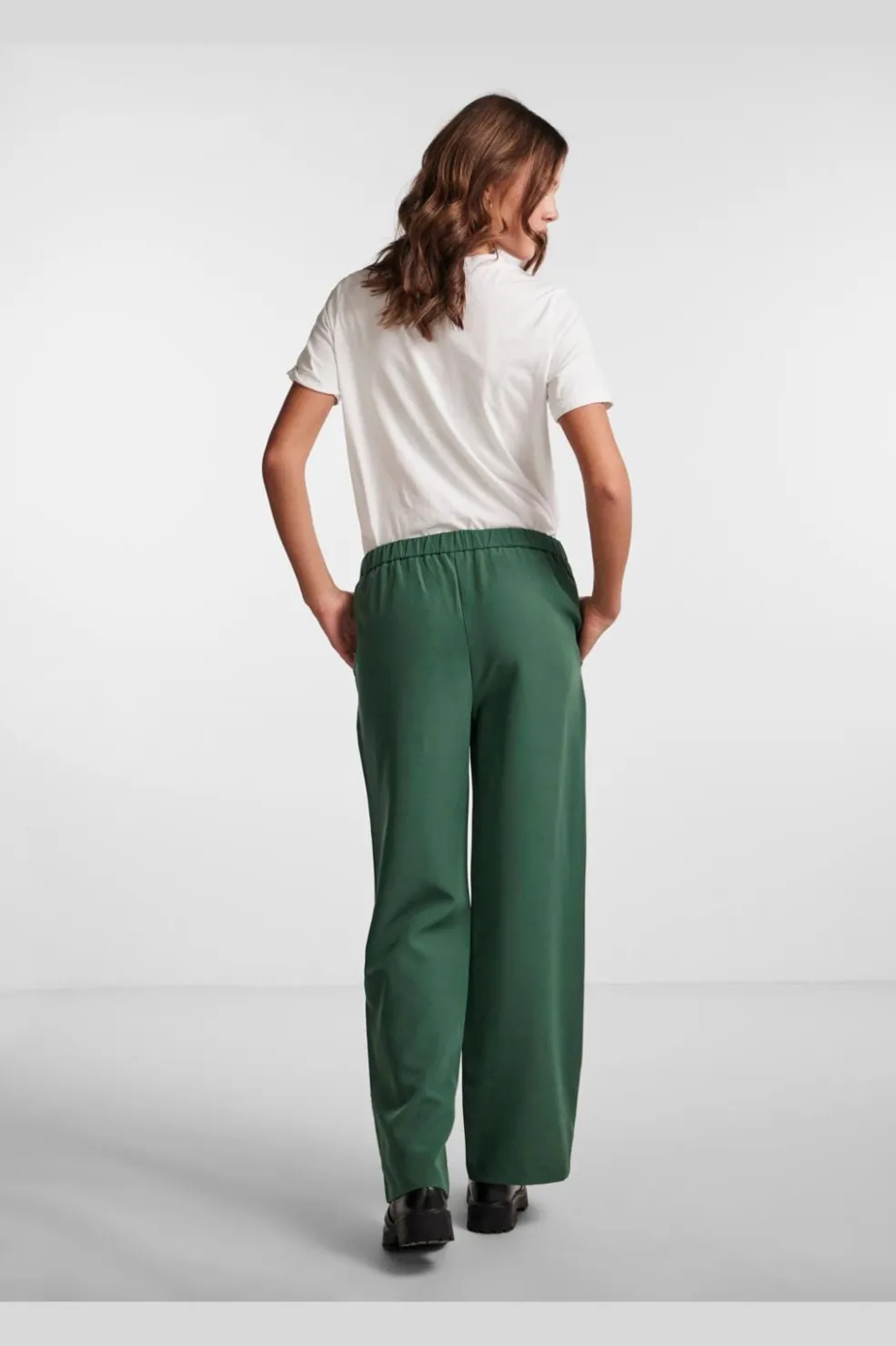 Bukser fra Pieces i mørkegrøn med løs pasform. De har høj talje med elastik og går til midt på læggen.