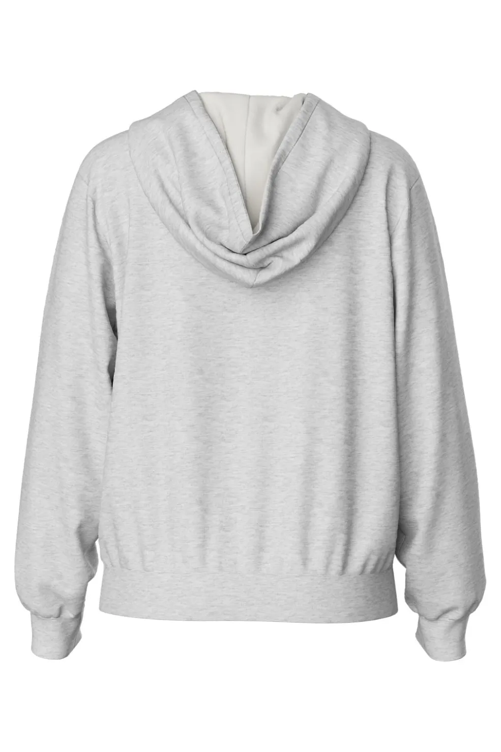 Lys grå hættetrøje fra Pieces med lynlås og snøre i hætten. Den melerede trøje har en regular fit og lange ærmer, hvilket gør den praktisk til både hjemmebrug og hverdagen.