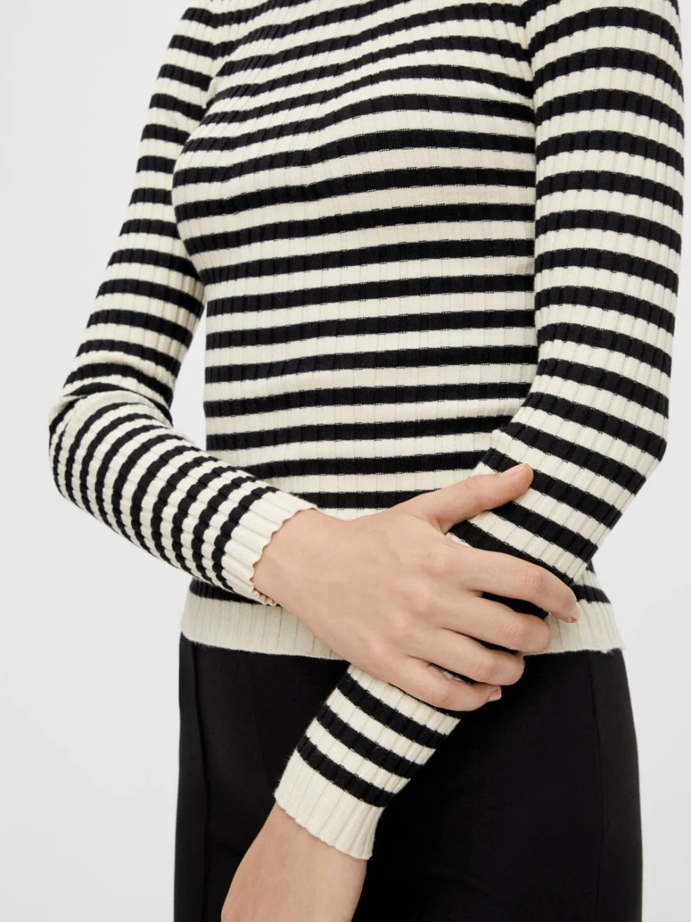Stribet striktrøje fra Pieces med sort og birkefarvet mønster. Den har en ribbet tekstur og slim fit-pasform, der giver et rent og enkelt udtryk.
