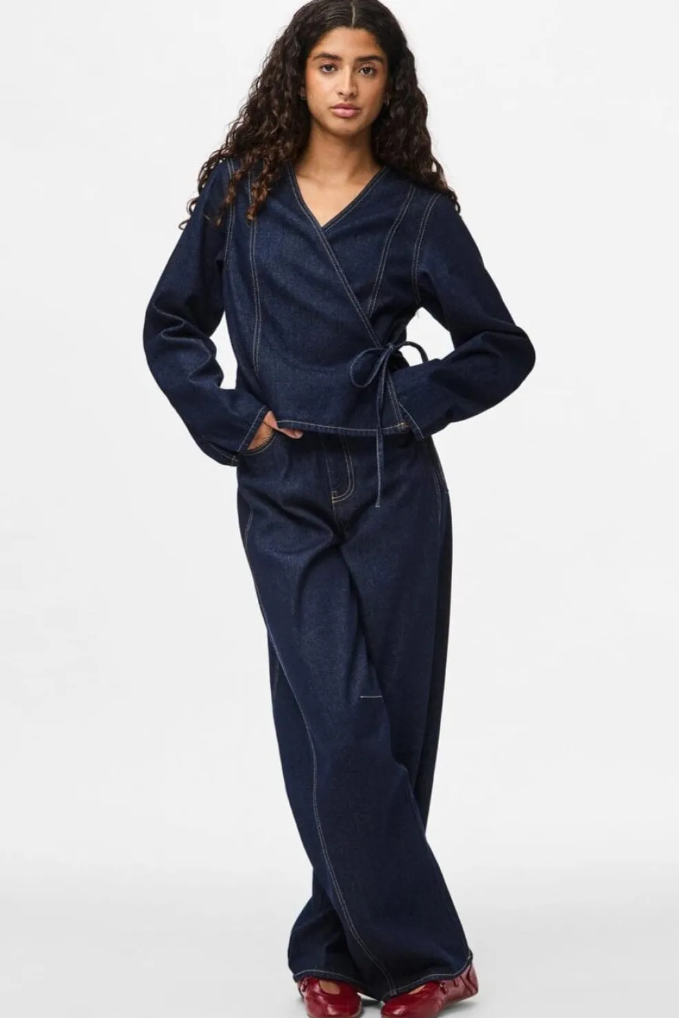 Denimskjorte fra Pieces i mørkeblå denim med v-hals og bindebånd i taljen. Skjorten har kontrasterende syninger og en wrap-lukning med bindebåndsdetaljer.