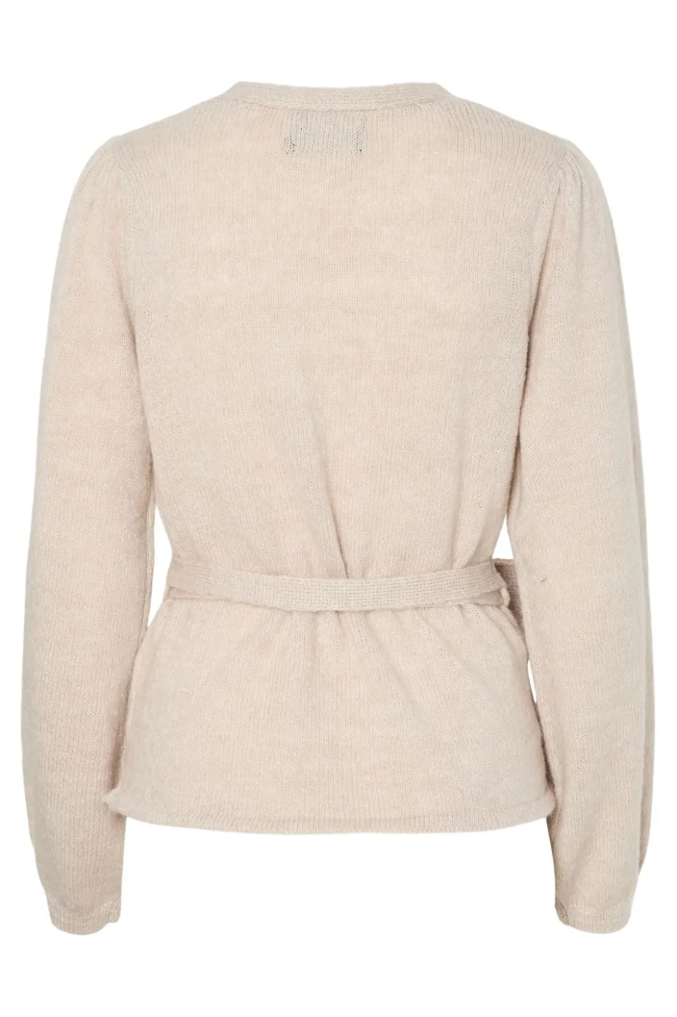 Strikket cardigan fra Pieces i sølvgrå melange. Den har V-hals, lange ærmer og sløjfedetaljer. En cardigan med almindelig pasform, der fungerer til både hverdag og fest.