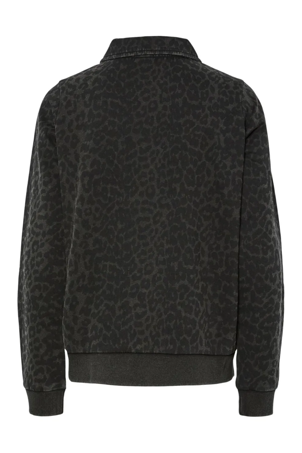 Langærmet polo fra Pieces med leopardmønster i sort og acid wash-finish. Poloen har ribstrikkede manchetter og en treknaps stolpelukning foran.